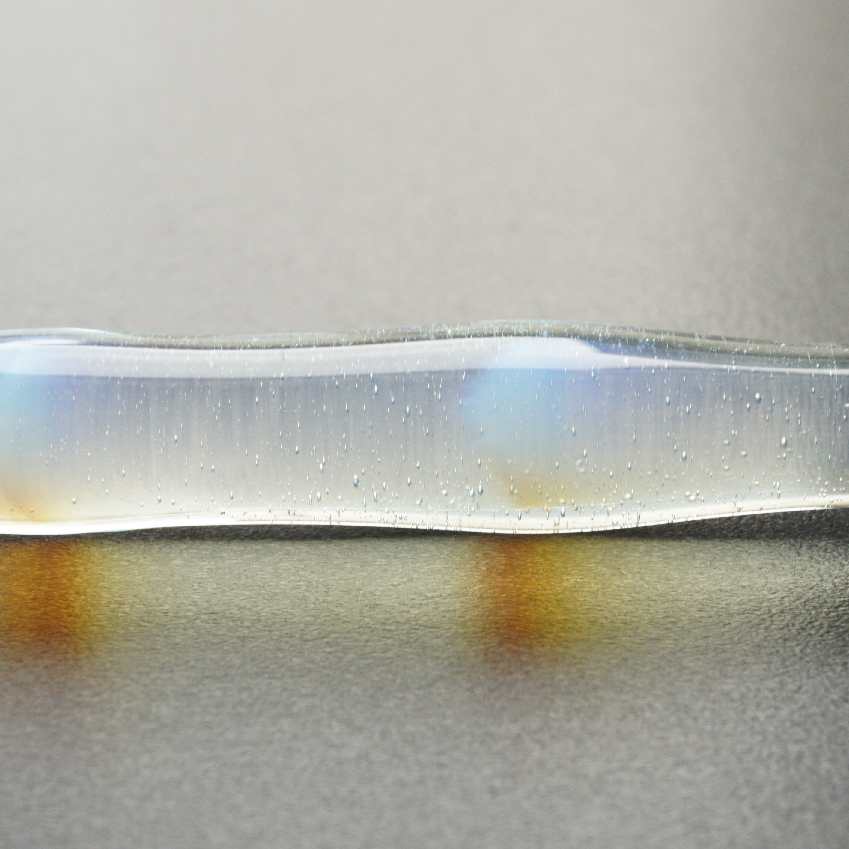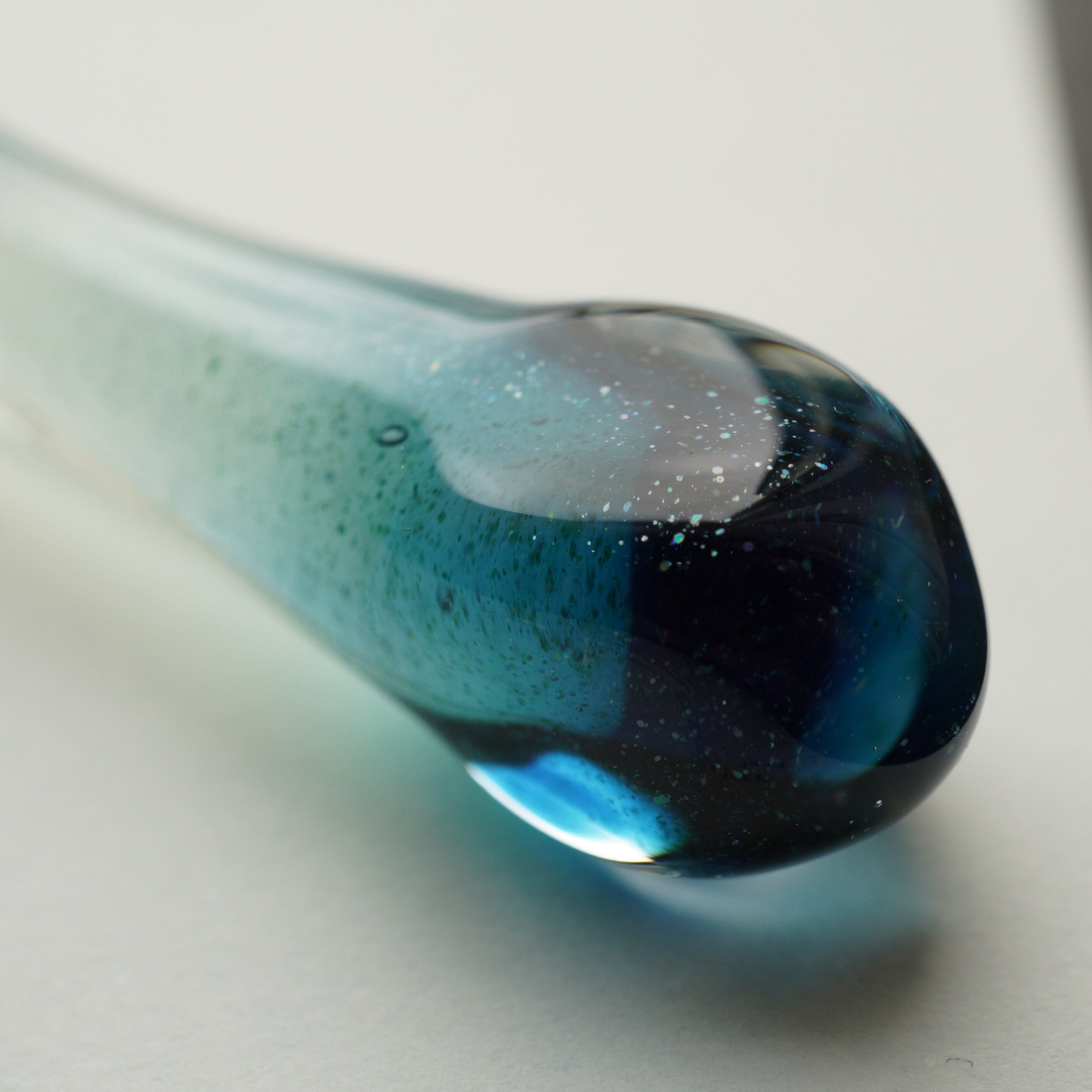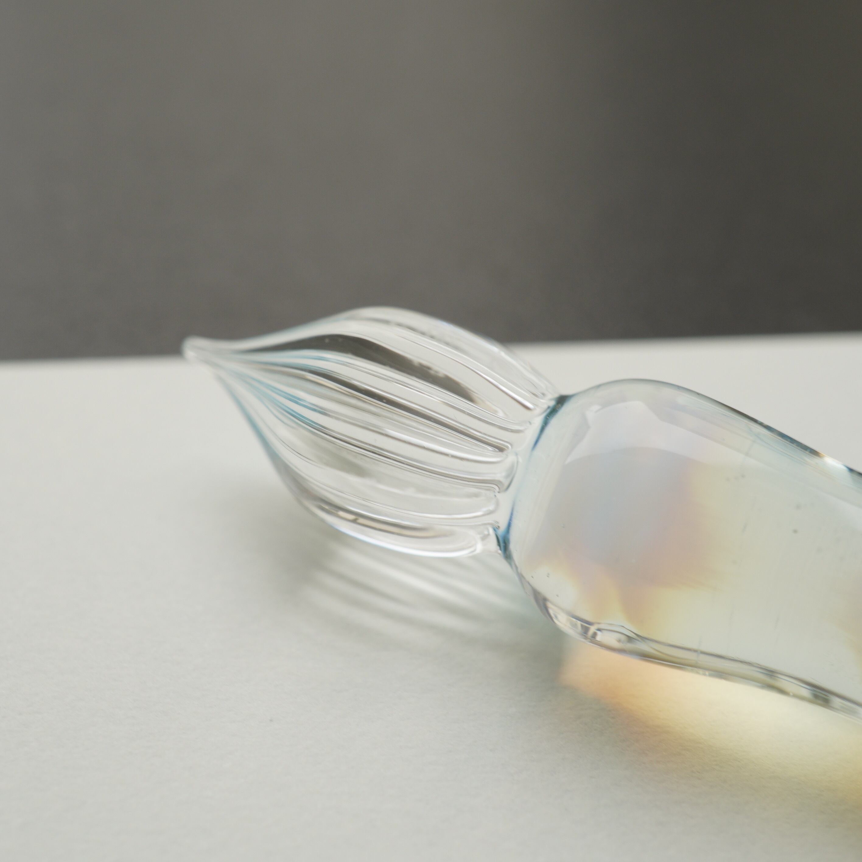 形によるものと、制作の時にガラスにかかる負荷を減らしたので、かく時に欠けにくくなったと思います。