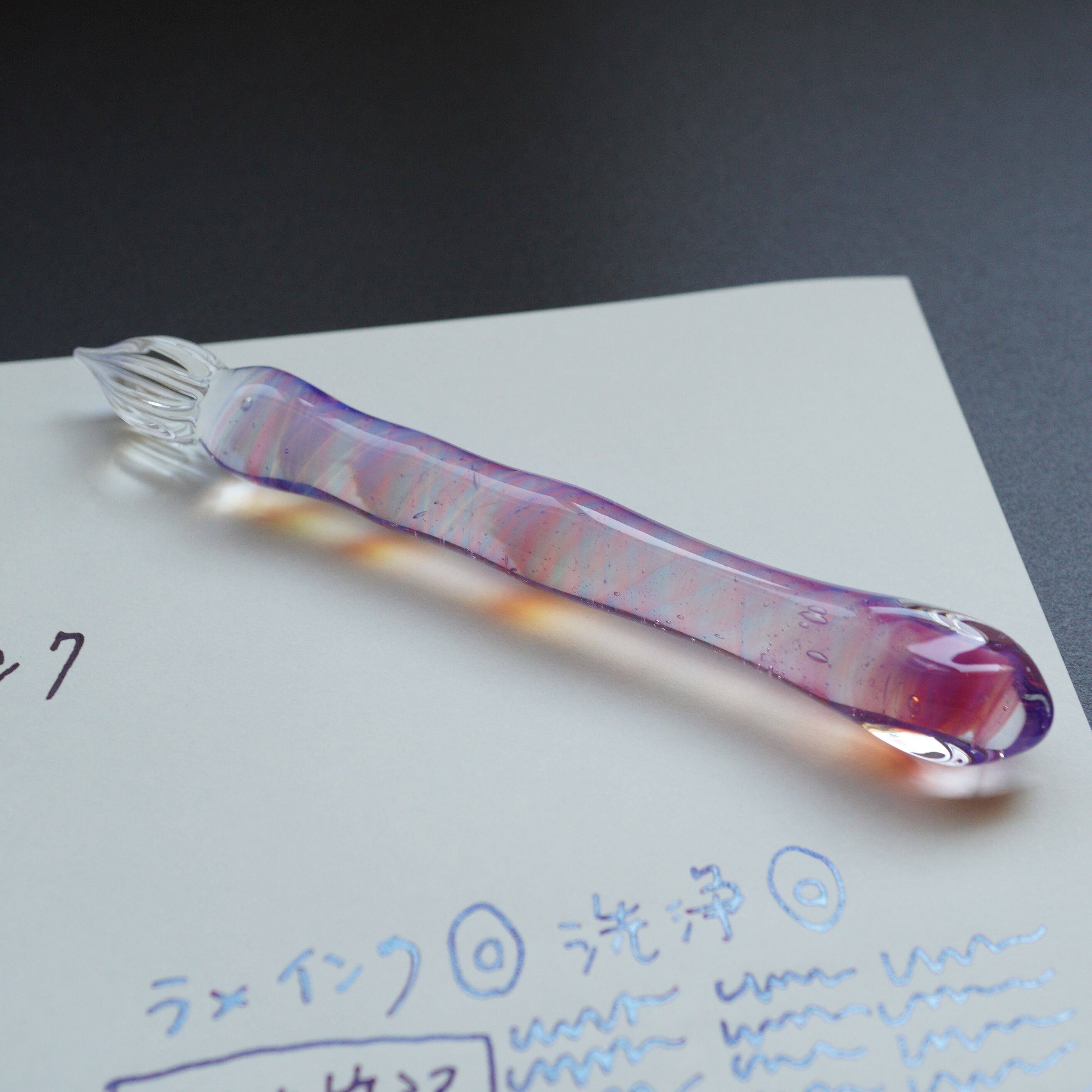 ガラスペンの大きさ、重さ、字幅、試し書き、書き心地などの個体情報を最後の写真に記載しています。書き心地は作家の感想で目安です。試し書きにあるラメインクは「ギター スパークルインキ ロイヤルブルー」です。
