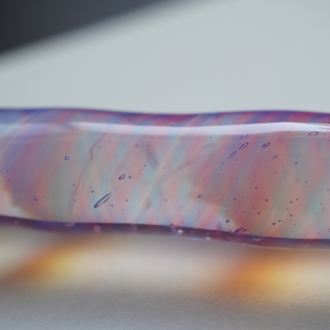 形によるものと、制作の時にガラスにかかる負荷を減らしたので、かく時に欠けにくくなったと思います。