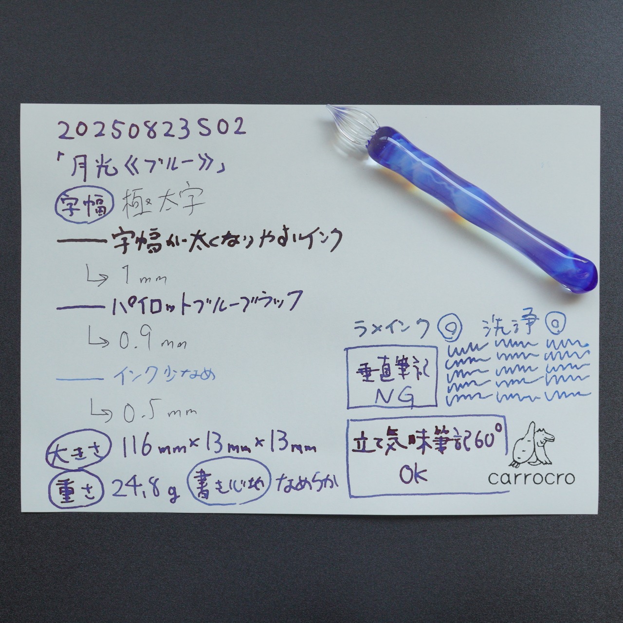 ガラスペンの大きさ、重さ、字幅、試し書き、書き心地などの個体情報を最後の写真に記載しています。書き心地は作家の感想で目安です。試し書きにあるラメインクは「ギター スパークルインキ ロイヤルブルー」です。