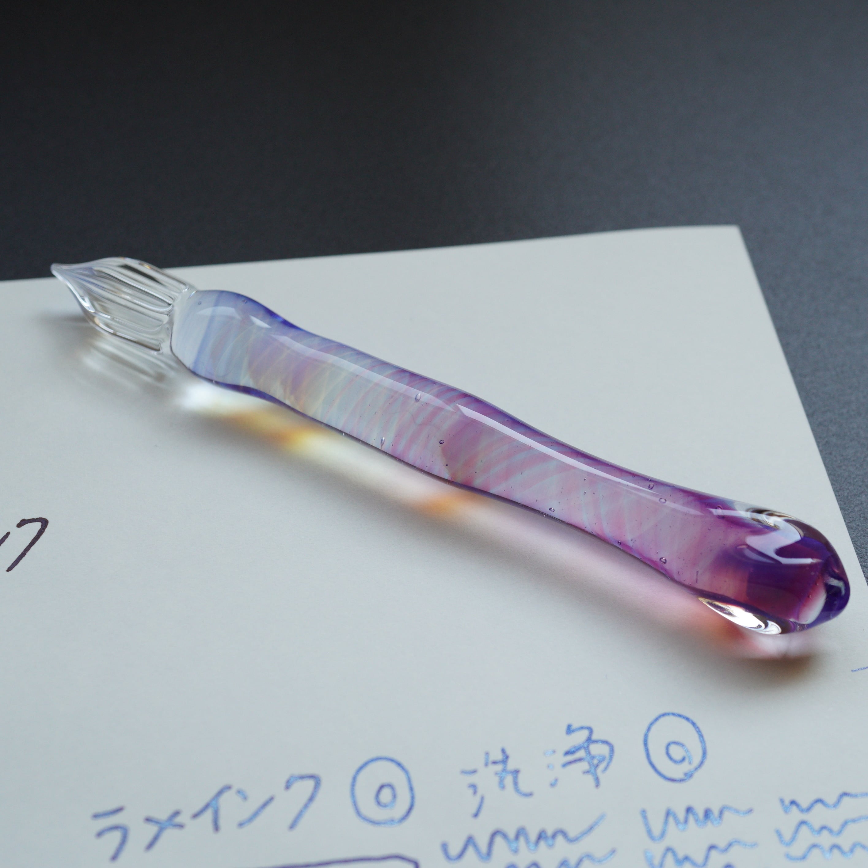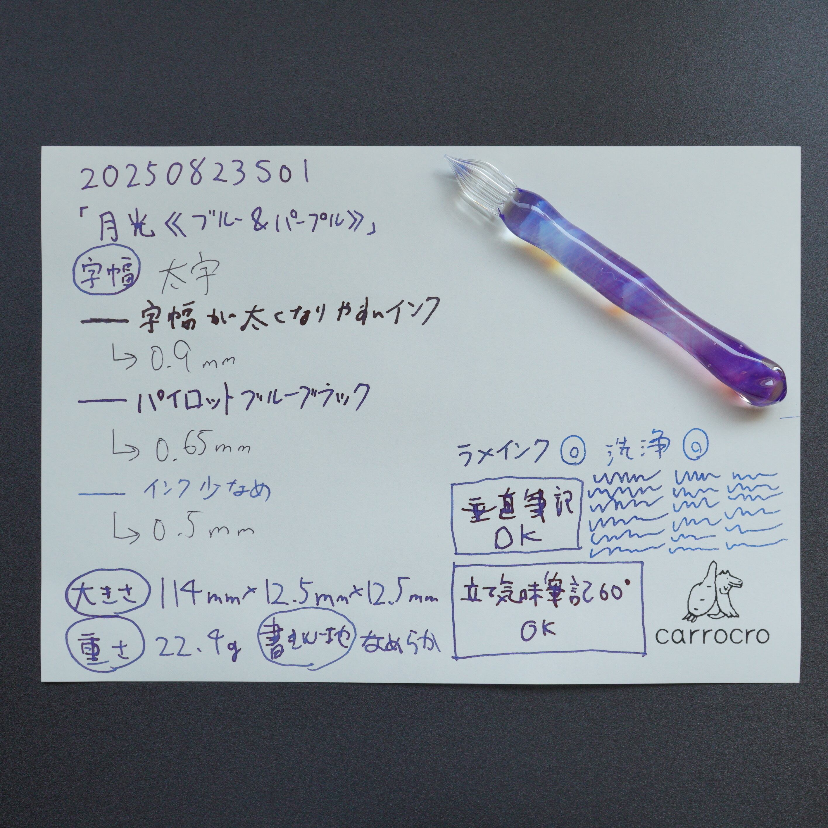 ガラスペンの大きさ、重さ、字幅、試し書き、書き心地などの個体情報を最後の写真に記載しています。書き心地は作家の感想で目安です。試し書きにあるラメインクは「ギター スパークルインキ ロイヤルブルー」です。