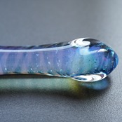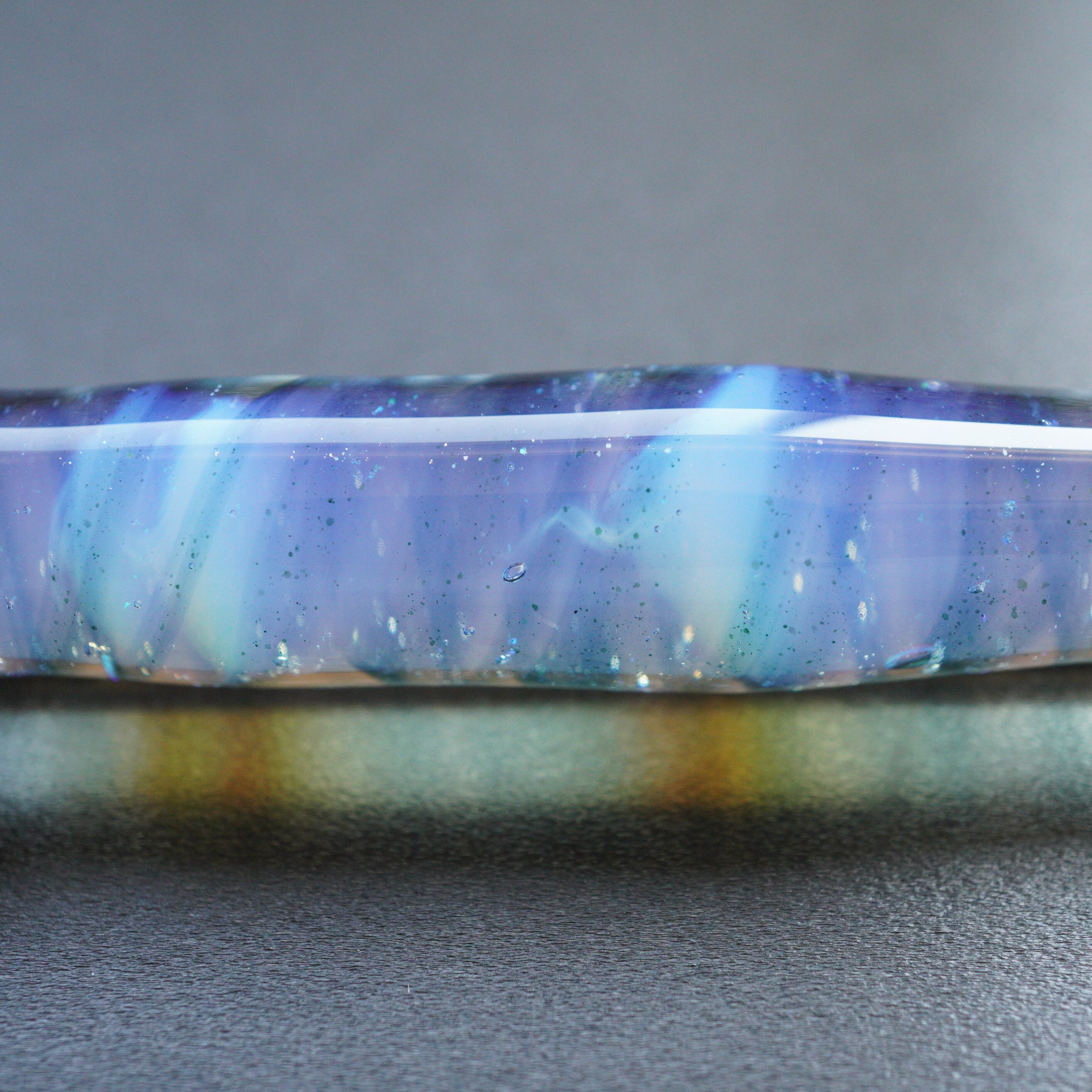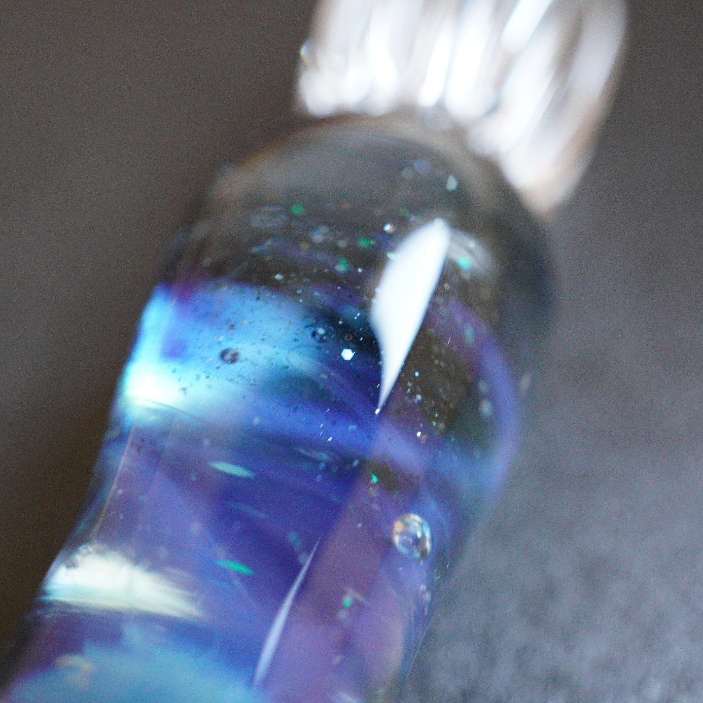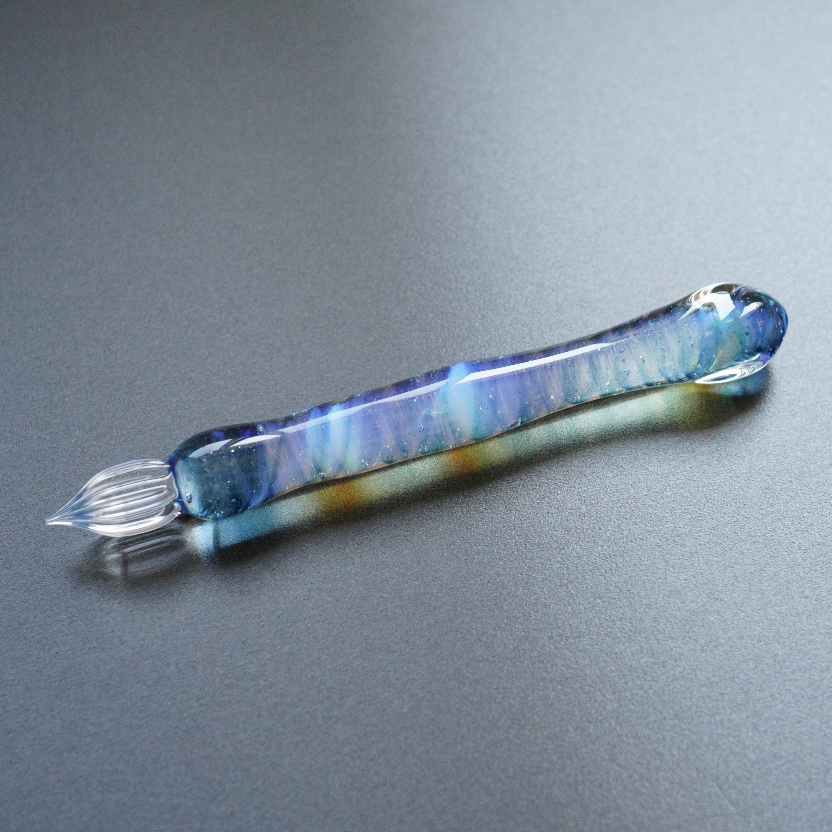 ガラスペンの大きさ、重さ、字幅、試し書き、書き心地などの個体情報を最後の写真に記載しています。書き心地は作家の感想で目安です。試し書きにあるラメインクは「ギター スパークルインキ ロイヤルブルー」です。