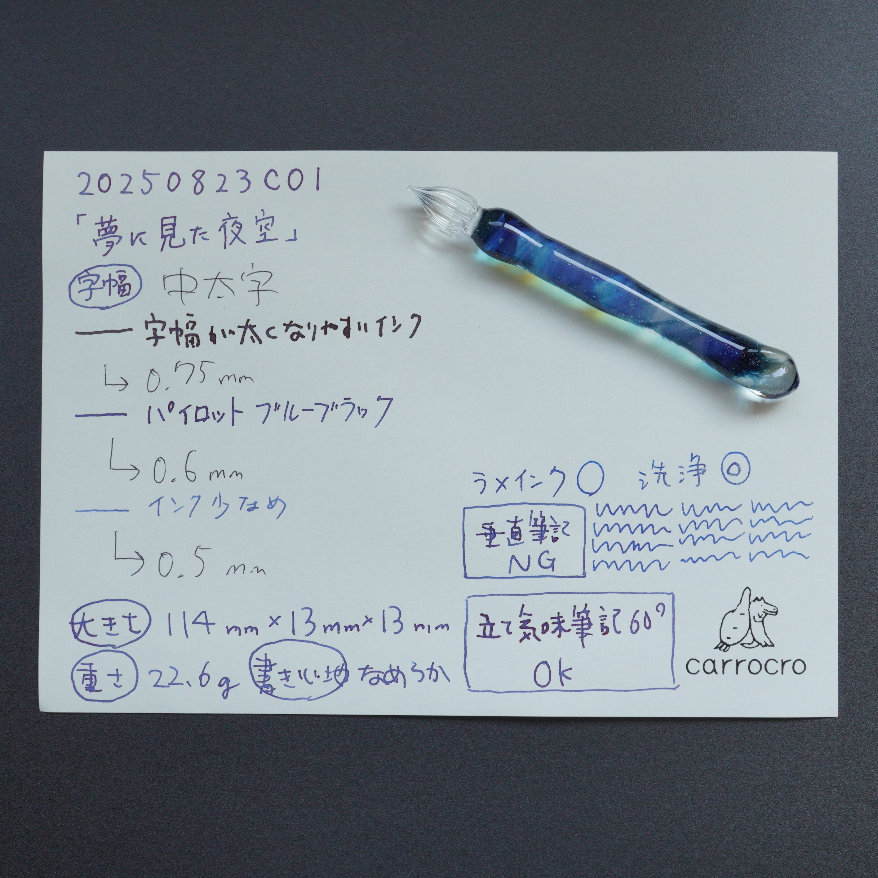 ガラスペンの大きさ、重さ、字幅、試し書き、書き心地などの個体情報を最後の写真に記載しています。書き心地は作家の感想で目安です。試し書きにあるラメインクは「ギター スパークルインキ ロイヤルブルー」です。
