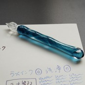 ガラスペンの大きさ、重さ、字幅、試し書き、書き心地などの個体情報を最後の写真に記載しています。書き心地は作家の感想で目安です。試し書きにあるラメインクは「ギター スパークルインキ ロイヤルブルー」です。