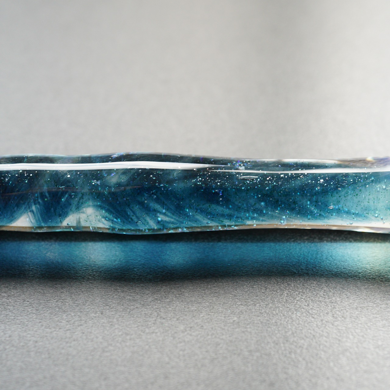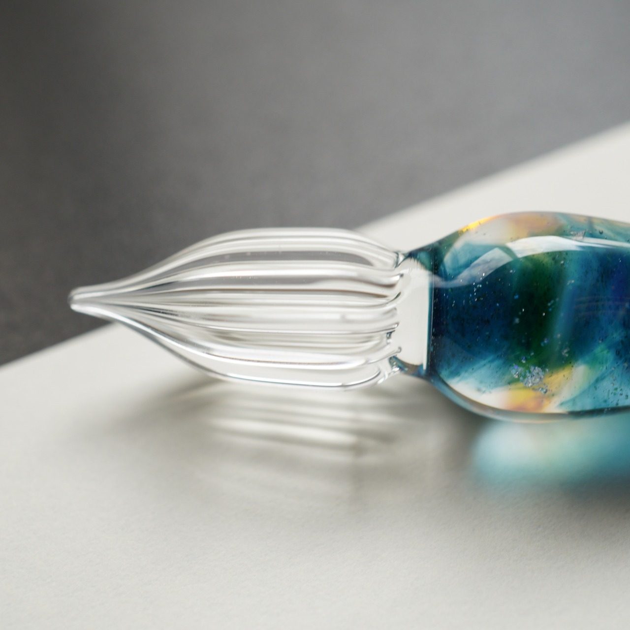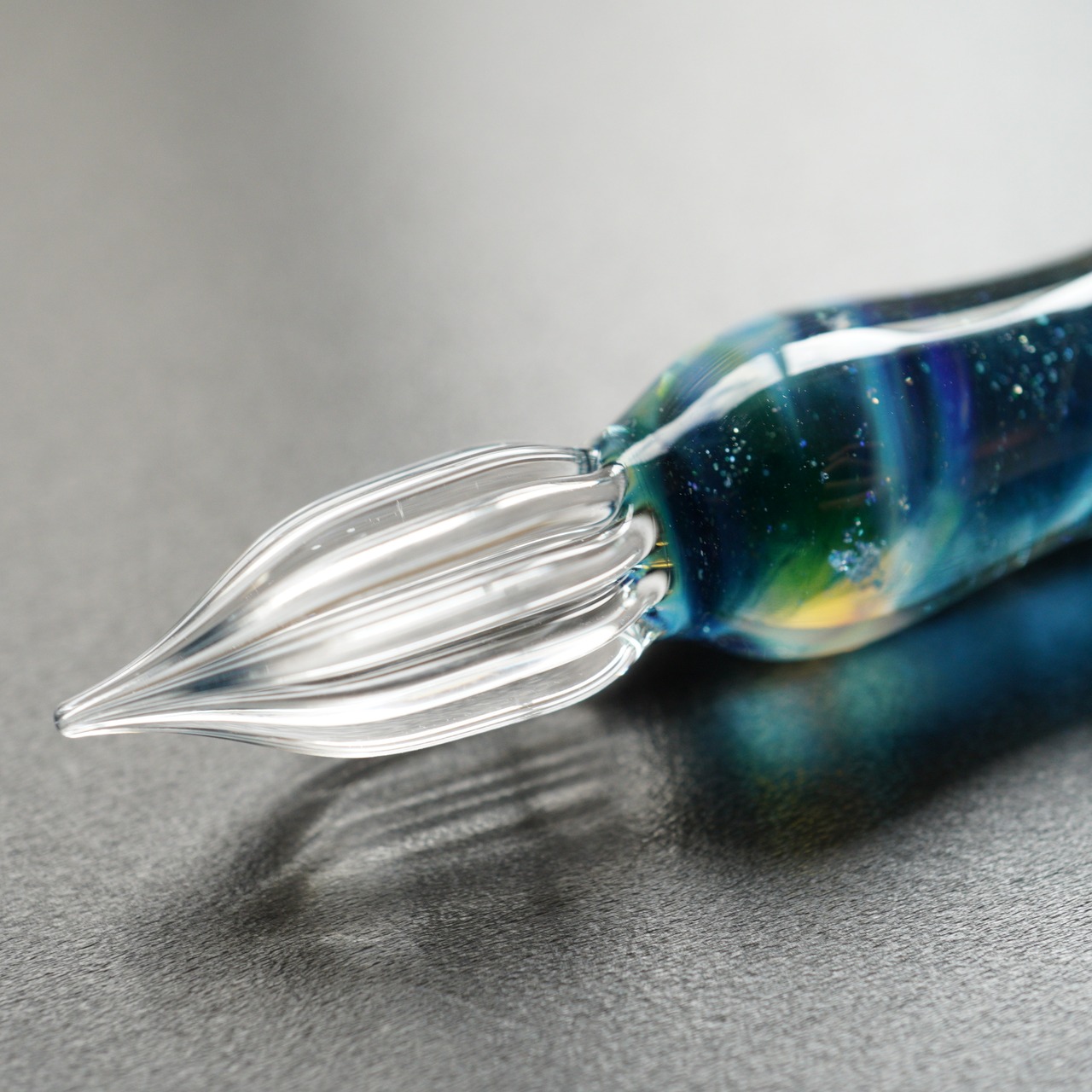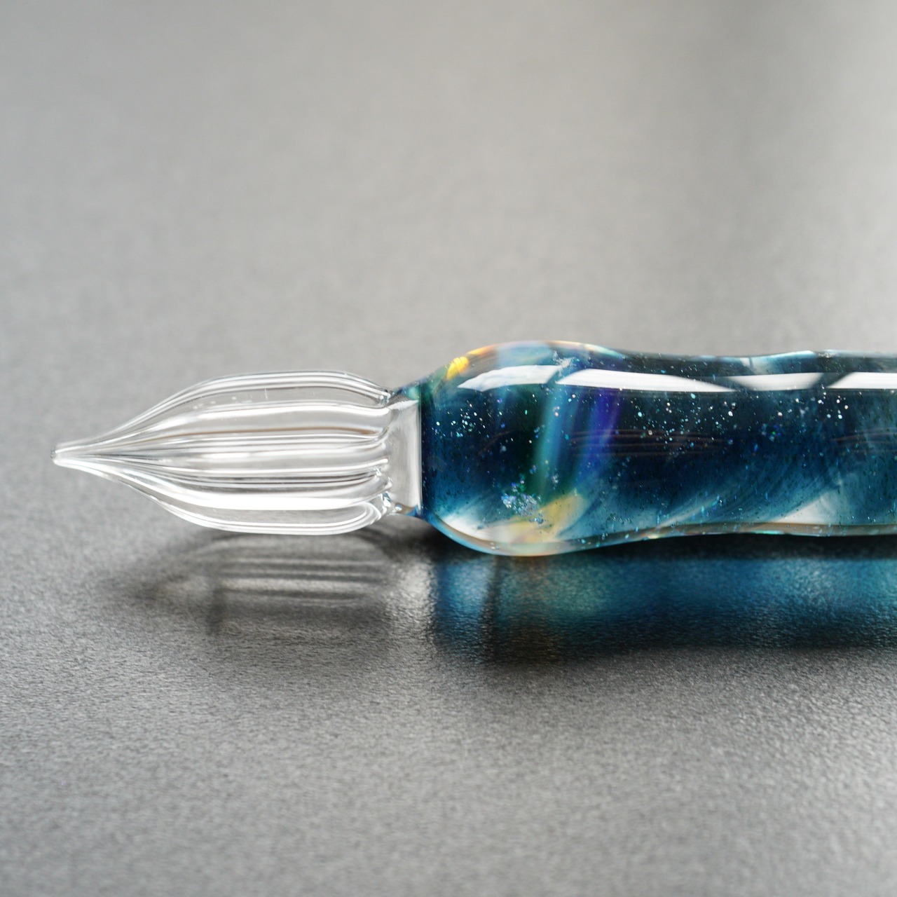 ガラスペンの大きさ、重さ、字幅、試し書き、書き心地などの個体情報を最後の写真に記載しています。書き心地は作家の感想で目安です。試し書きにあるラメインクは「ギター スパークルインキ ロイヤルブルー」です。