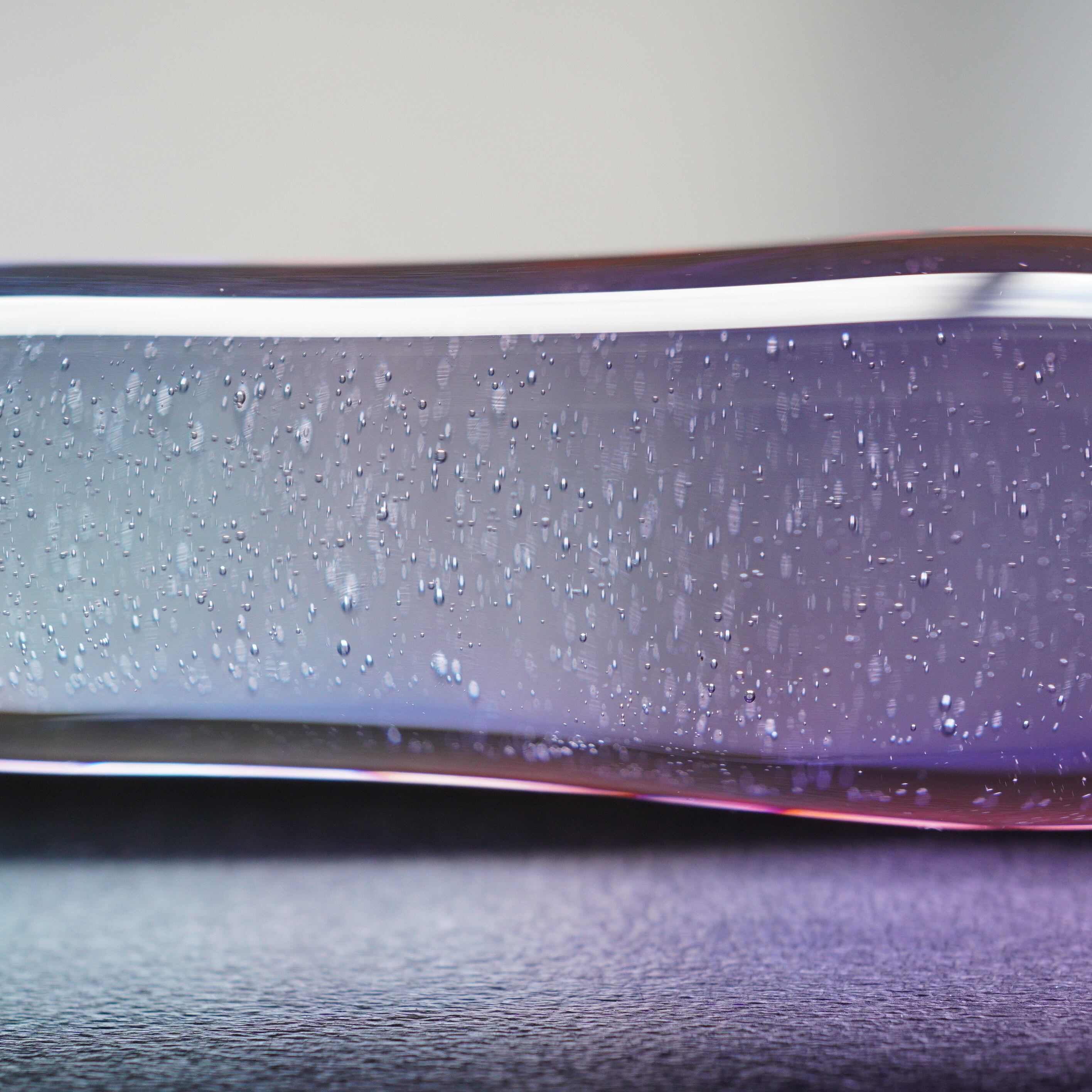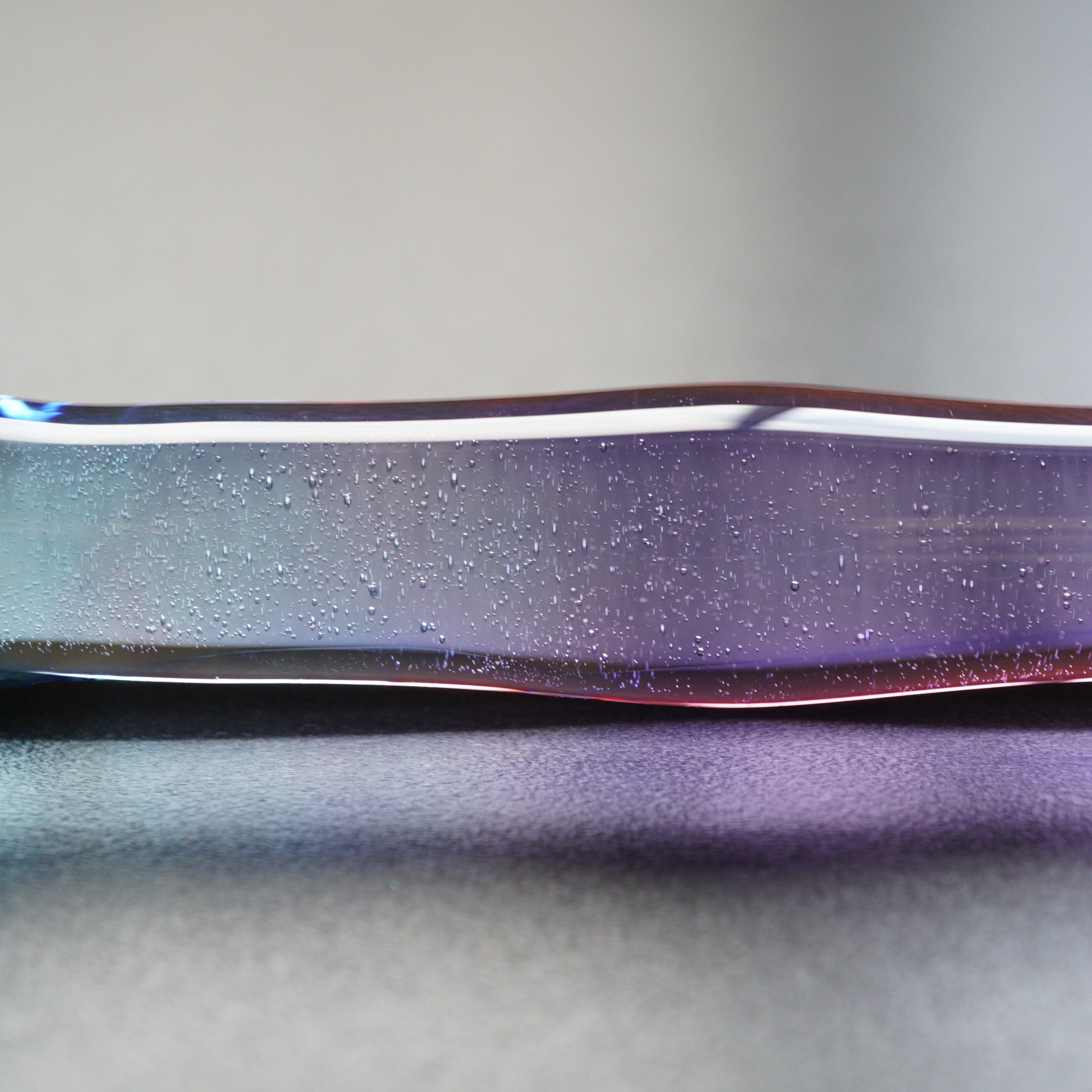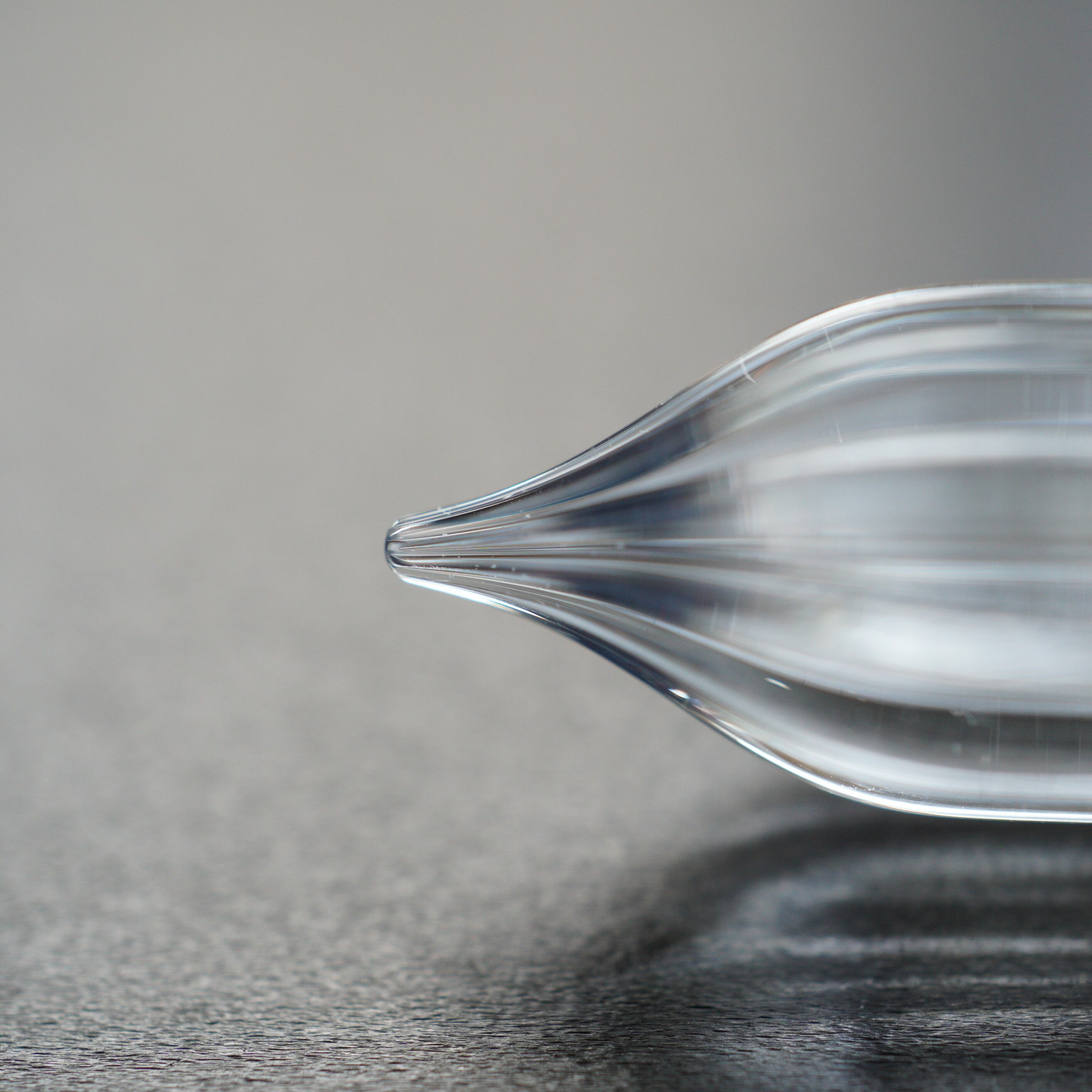形によるものと、制作の時にガラスにかかる負荷を減らしたので、かく時に欠けにくくなったと思います。