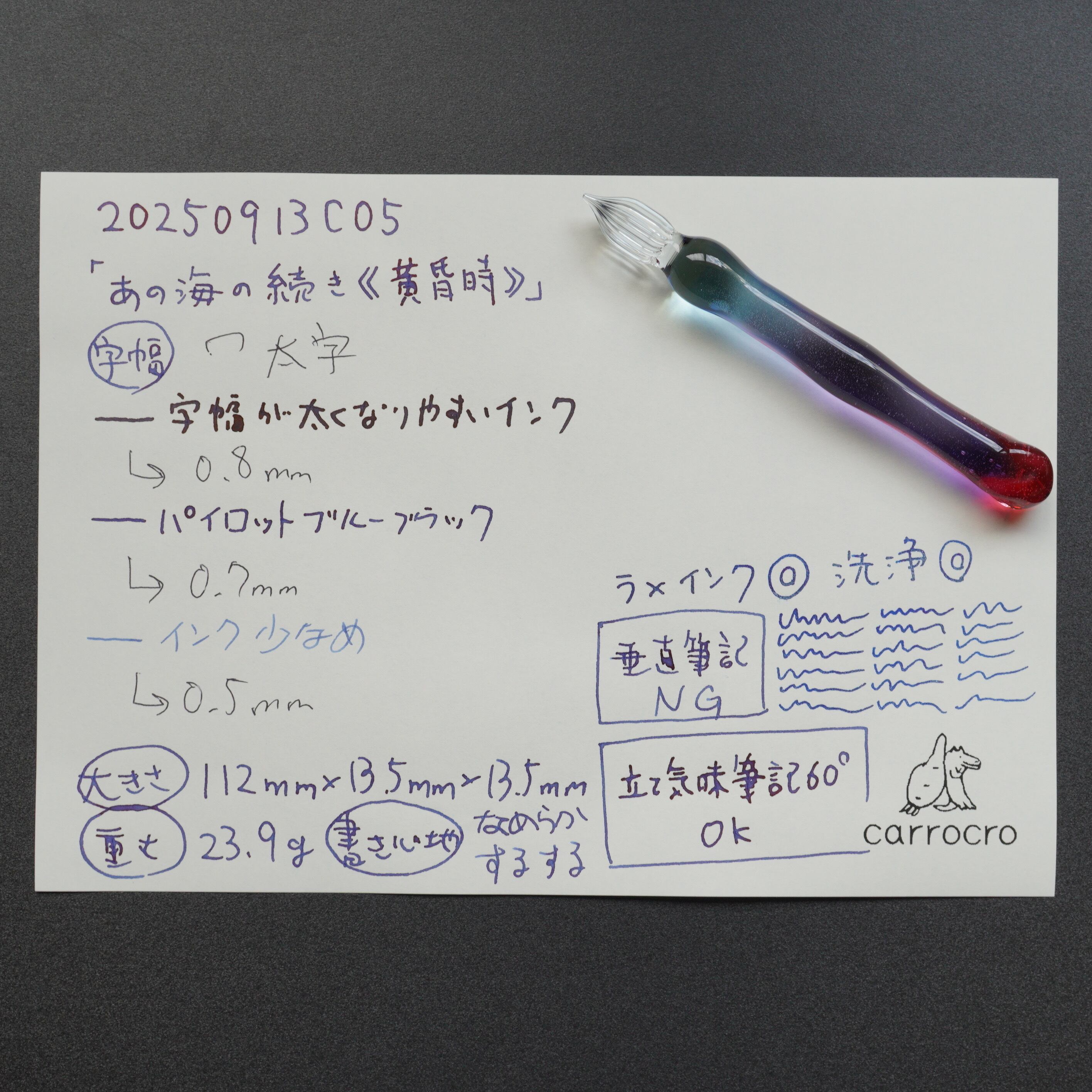 ガラスペンの大きさ、重さ、字幅、試し書き、書き心地などの個体情報を最後の写真に記載しています。書き心地は作家の感想で目安です。試し書きにあるラメインクは「ギター スパークルインキ ロイヤルブルー」です。