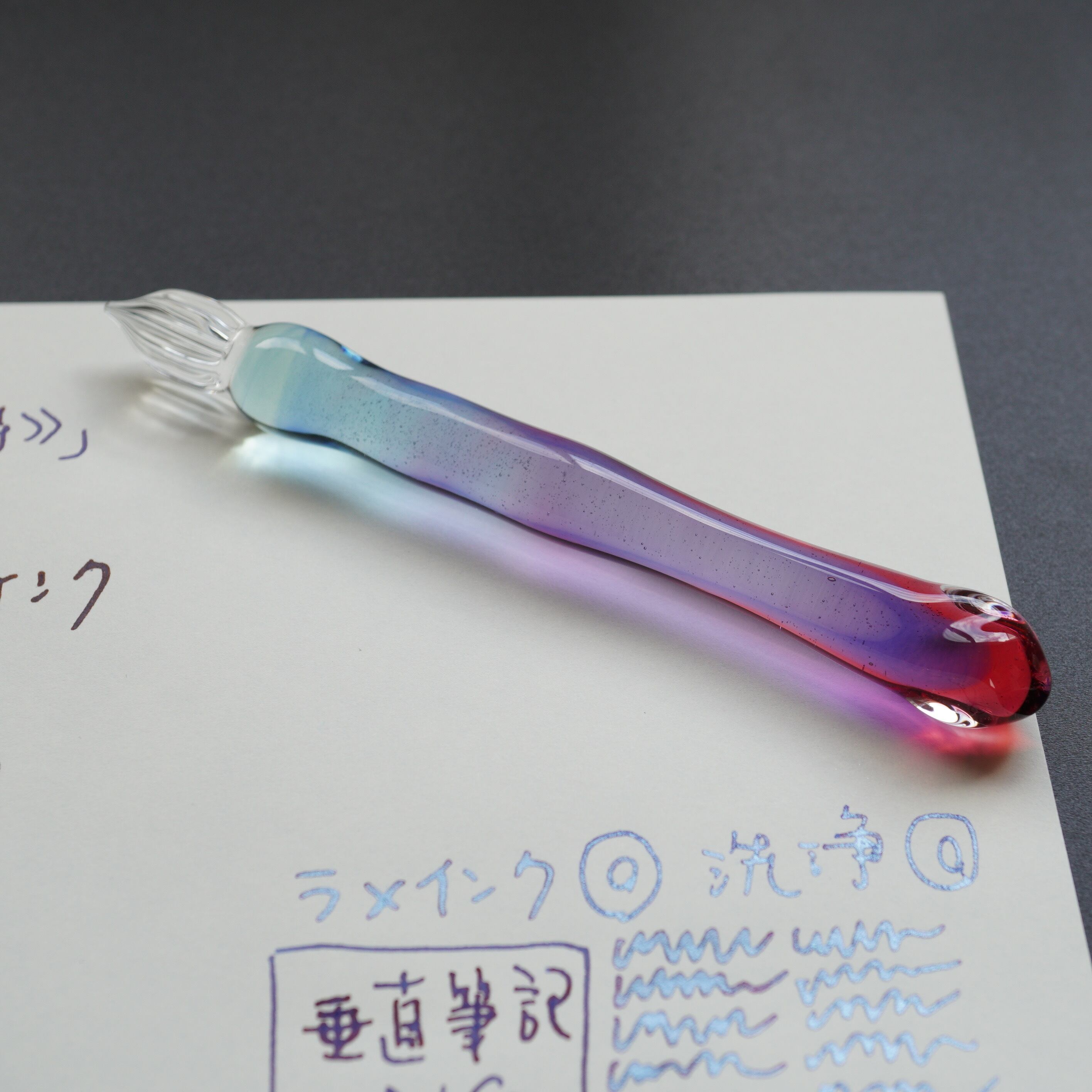 ガラスペンの大きさ、重さ、字幅、試し書き、書き心地などの個体情報を最後の写真に記載しています。書き心地は作家の感想で目安です。試し書きにあるラメインクは「ギター スパークルインキ ロイヤルブルー」です。
