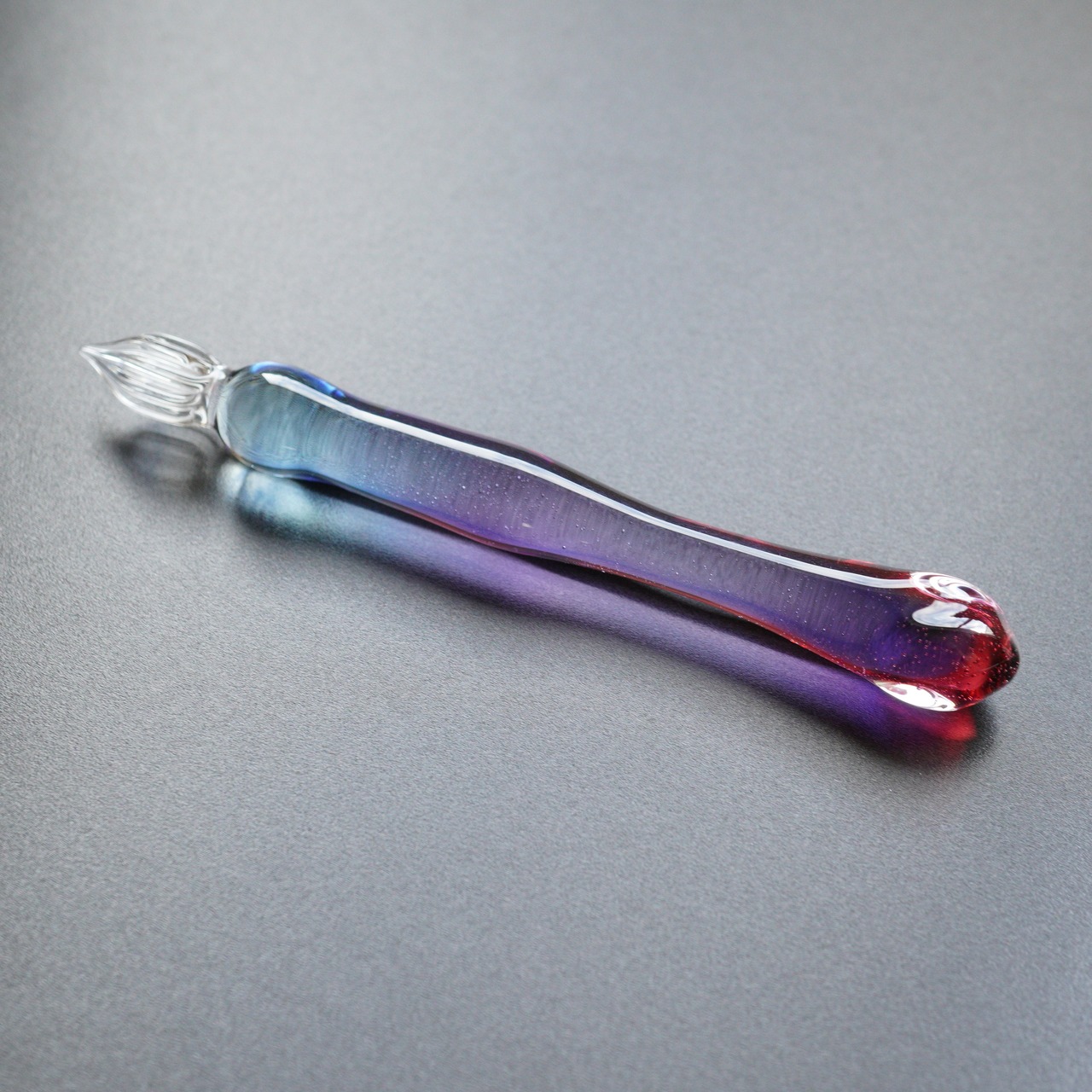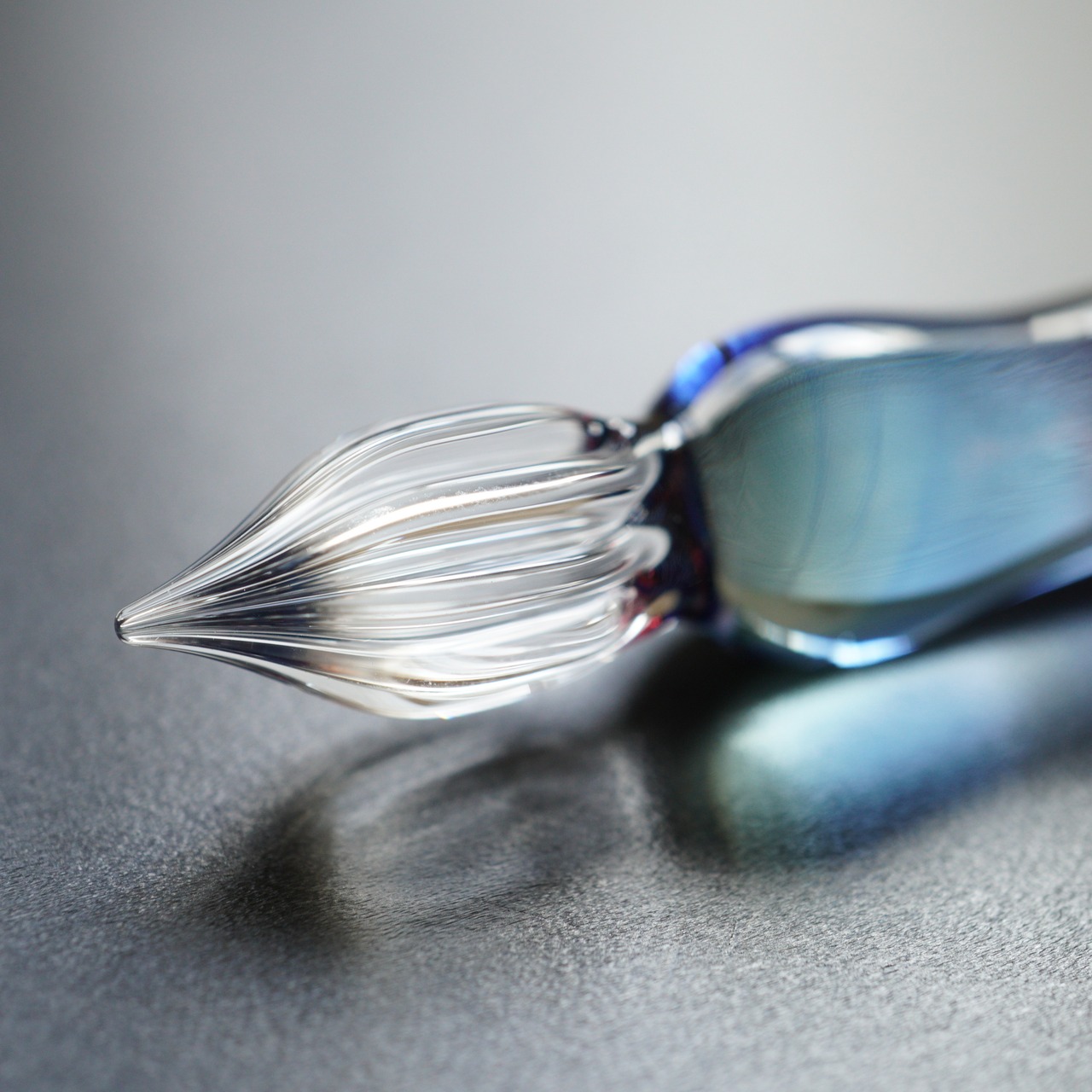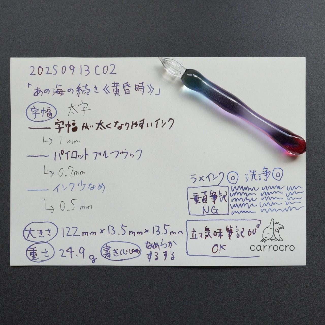 ガラスペンの大きさ、重さ、字幅、試し書き、書き心地などの個体情報を最後の写真に記載しています。書き心地は作家の感想で目安です。試し書きにあるラメインクは「ギター スパークルインキ ロイヤルブルー」です。