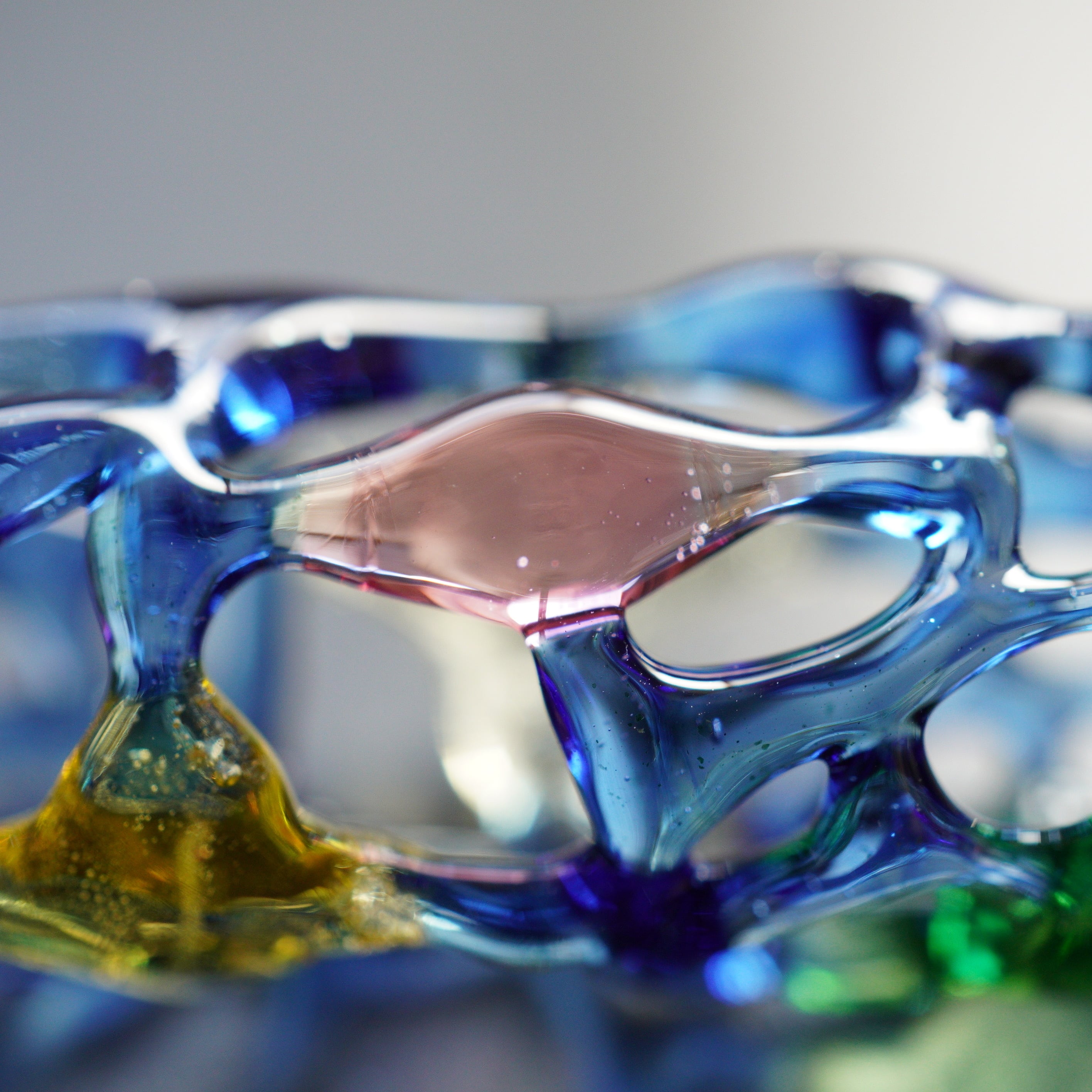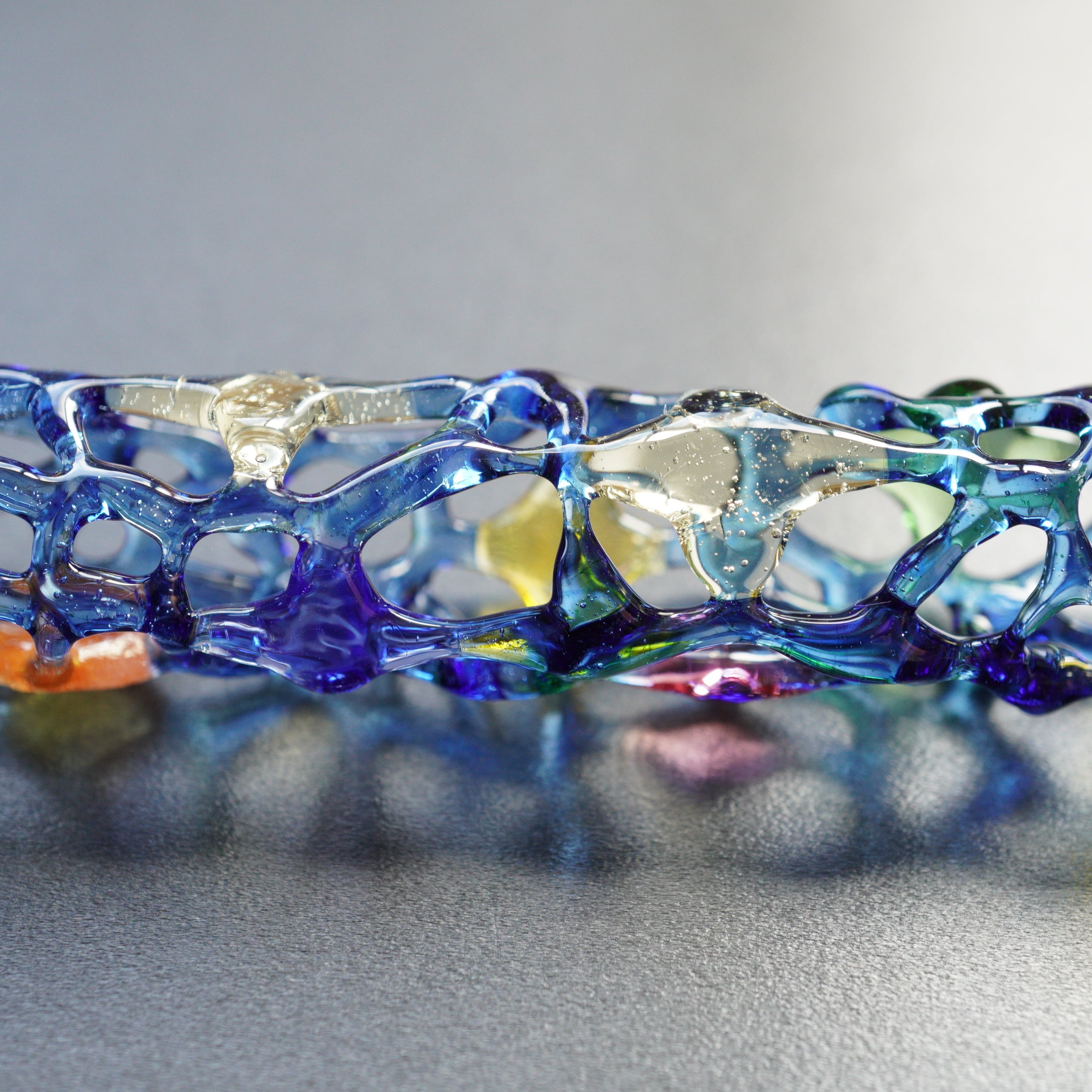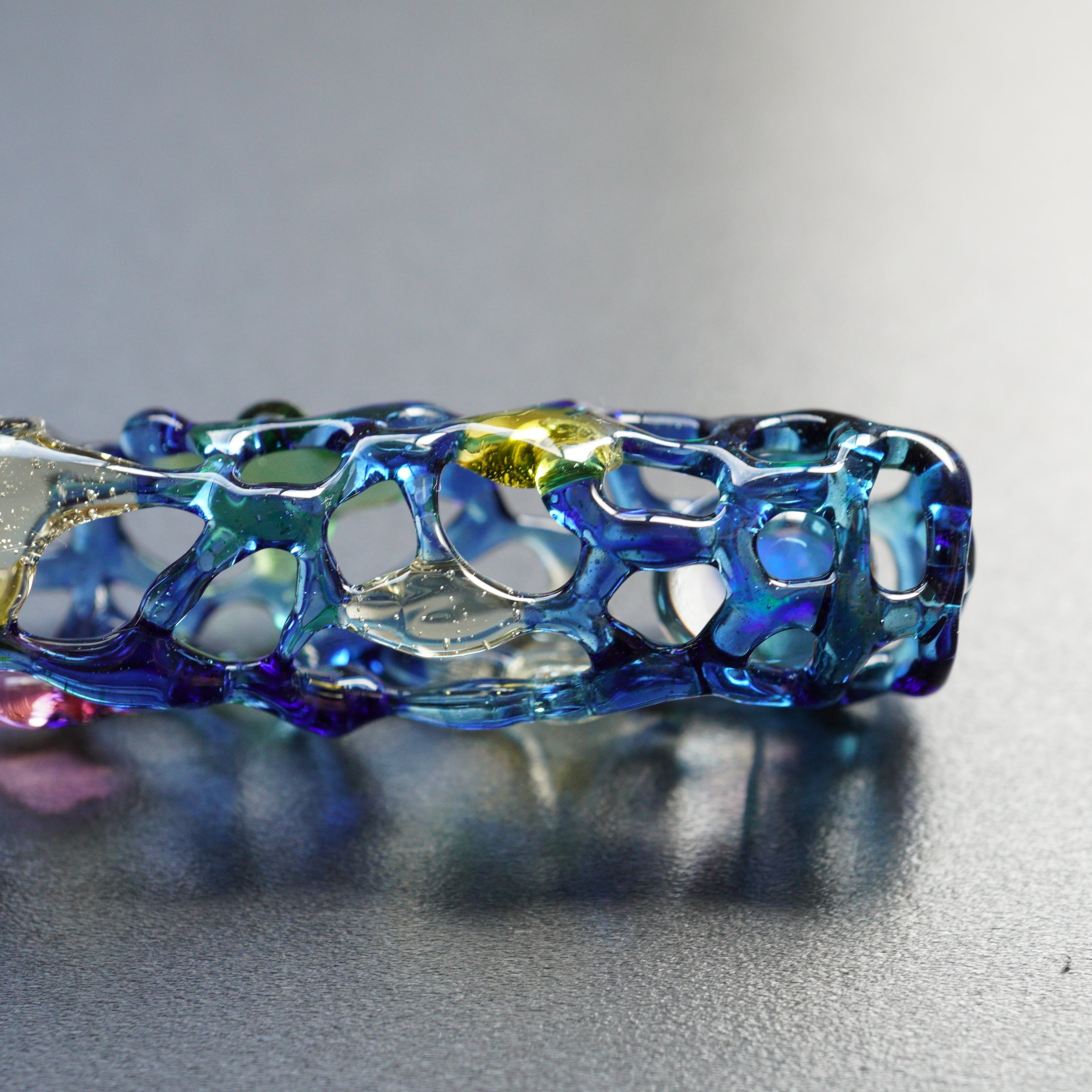 ガラスで作ったあみあみの中にオパールが入ったガラスを入れています。