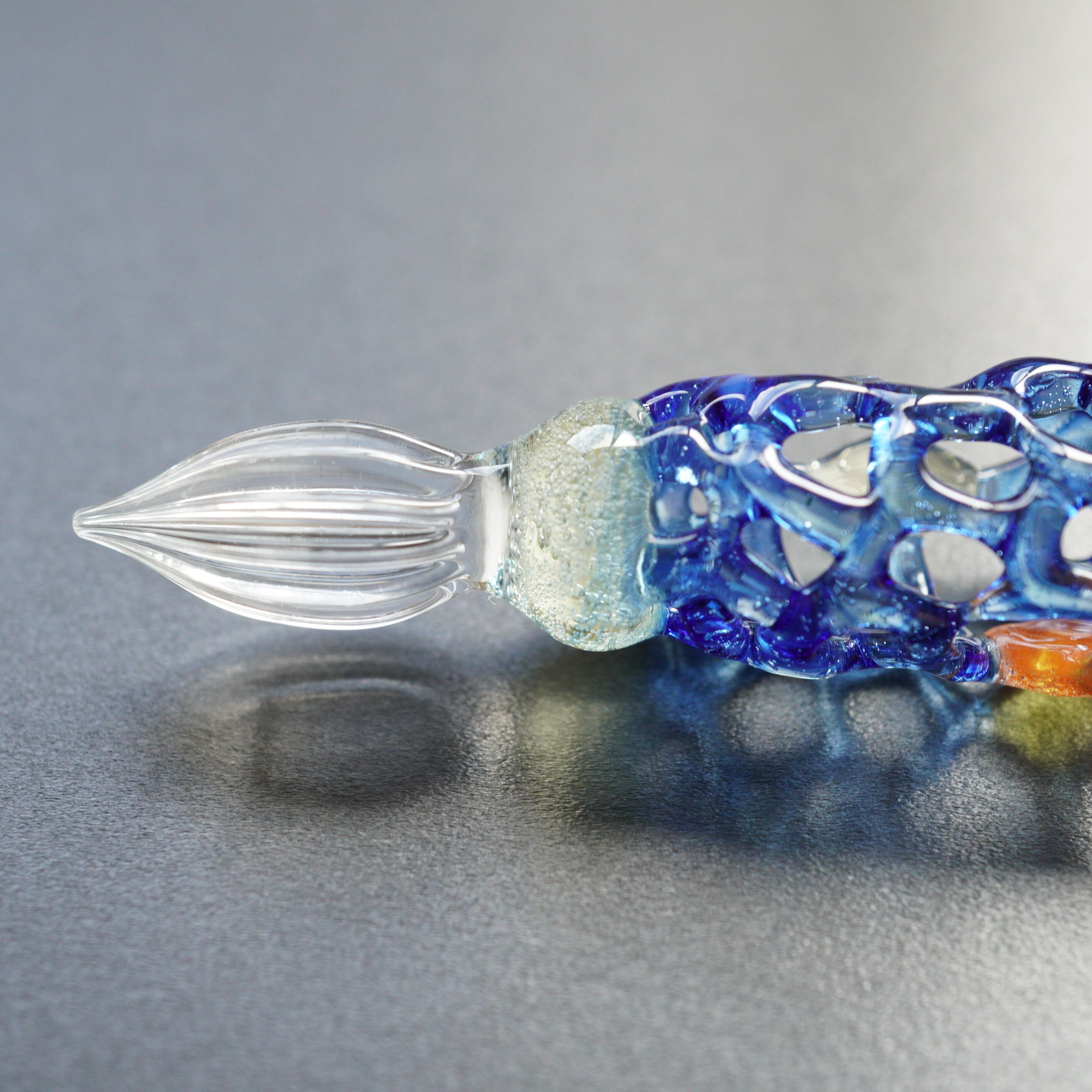 6.ガラスのかたまりを透明ガラスでコーティングし、引き伸ばしてつなぎ目のない軸を作っているので組成的に丈夫。(ゆりかごガラスペンは除く)
