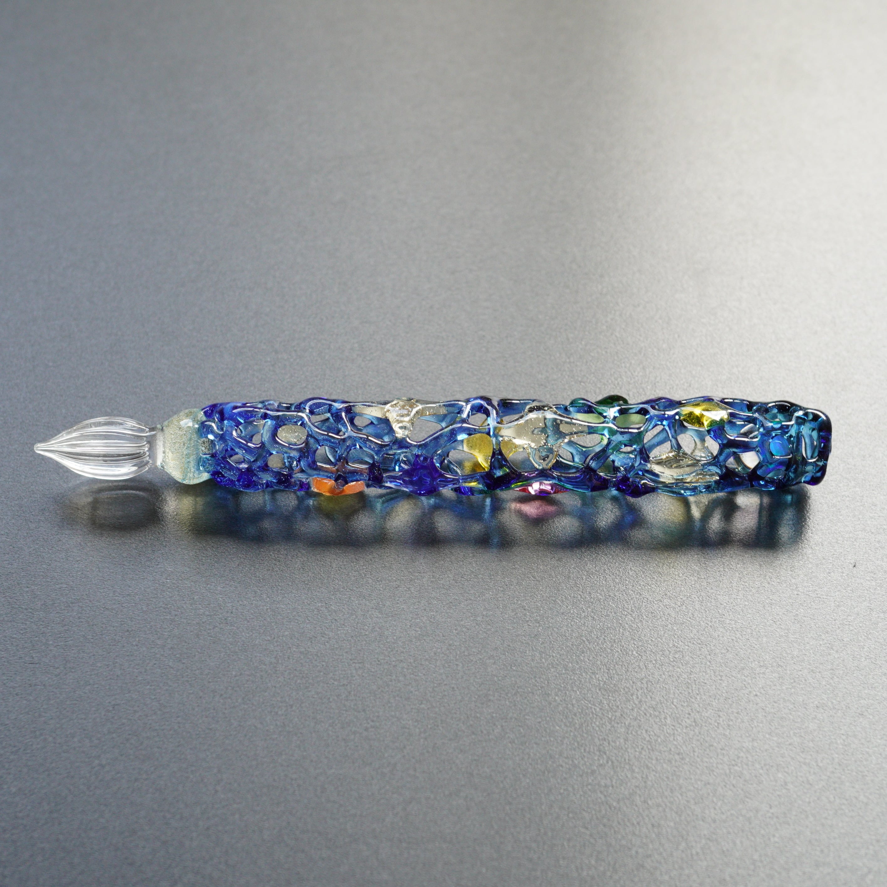 星の光が輝くようなデザインのゆりかごガラスペンです。様々な色の星がキラキラと瞬いています。