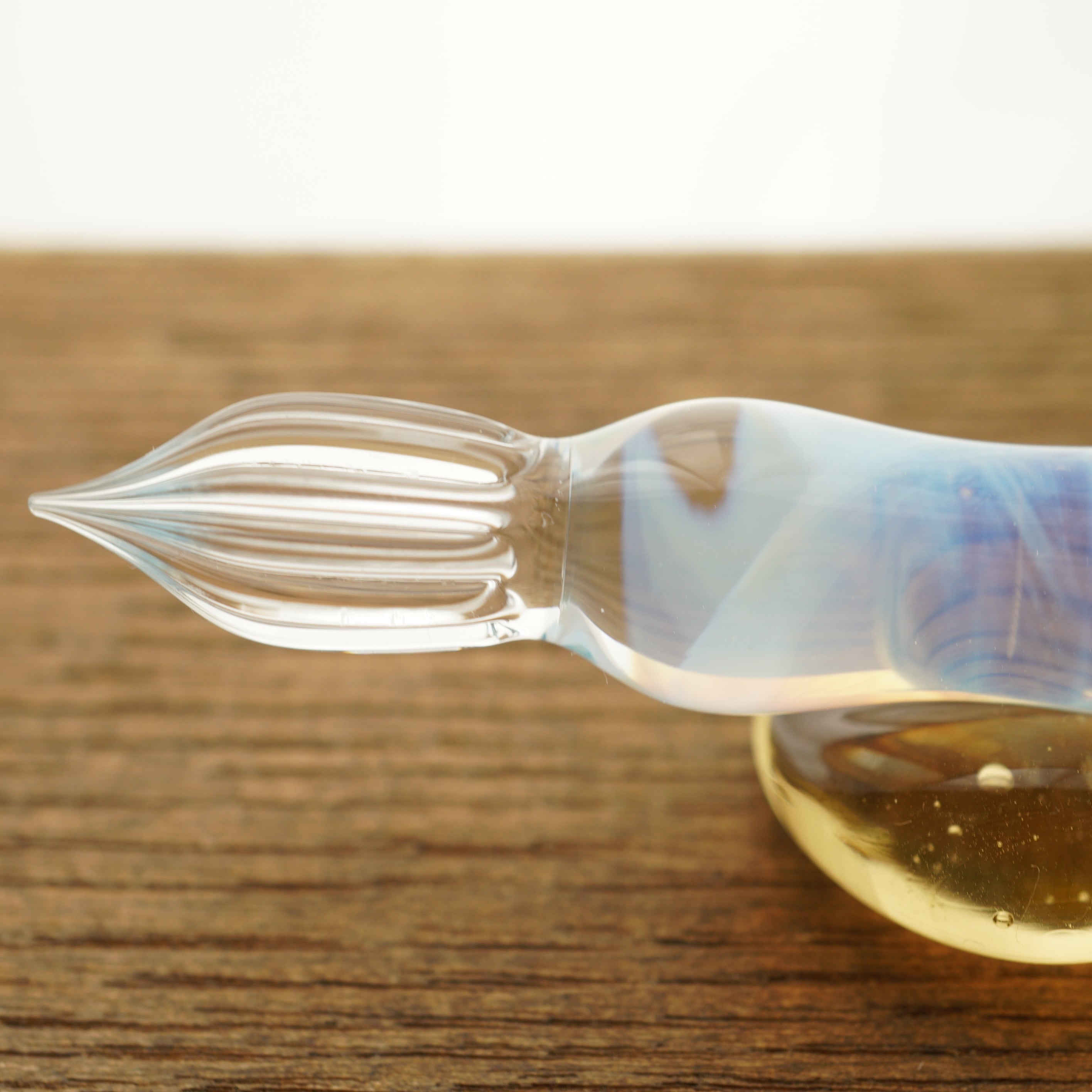 ガラスペンの大きさ、重さ、字幅、試し書き、書き心地などの個体情報を最後の写真に記載しています。書き心地は作家の感想で目安です。試し書きにあるラメインクは「ギター スパークルインキ ロイヤルブルー」です。