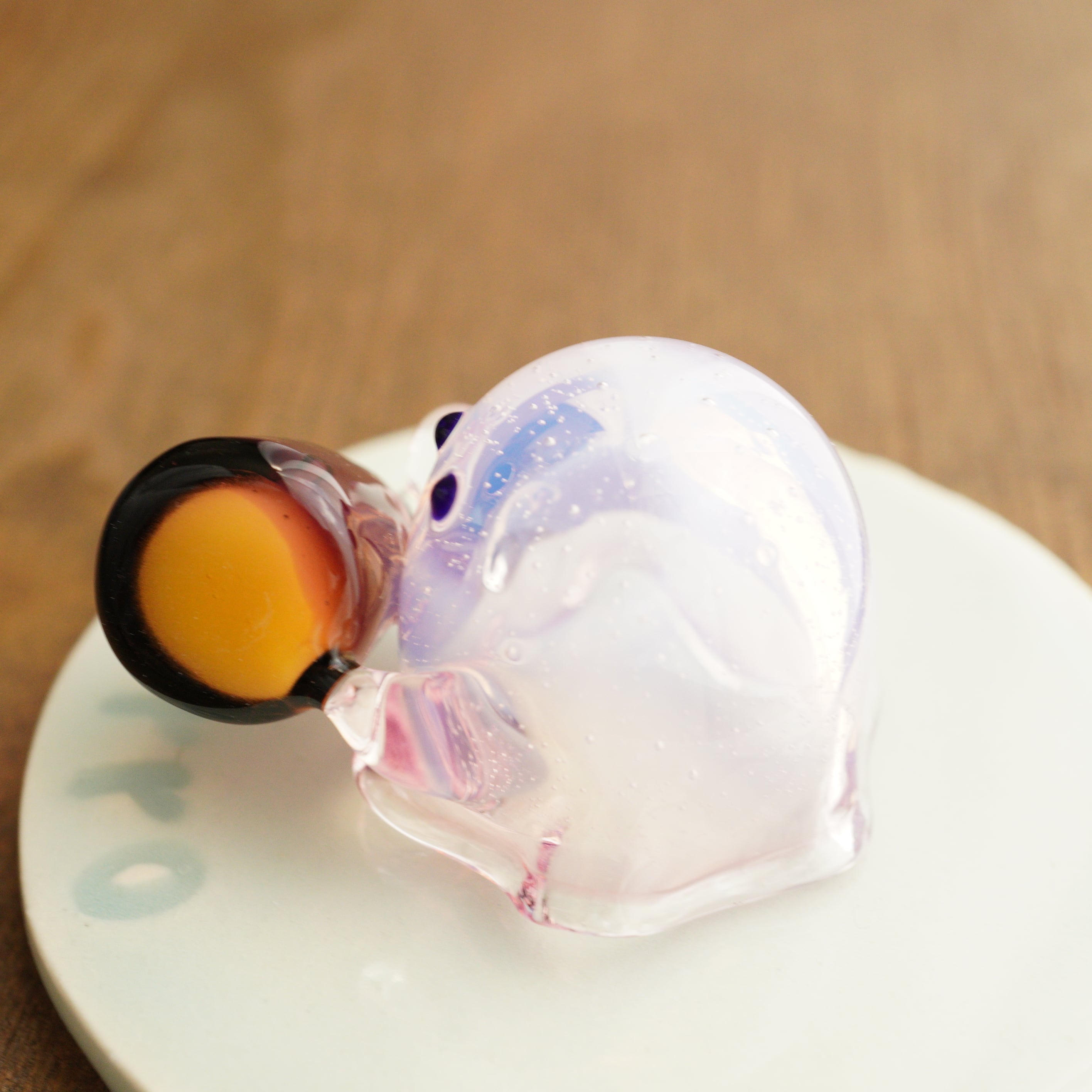 ガラスのおばけ、キャロちゃんが大きい焼き芋を抱えて食べようとしています。