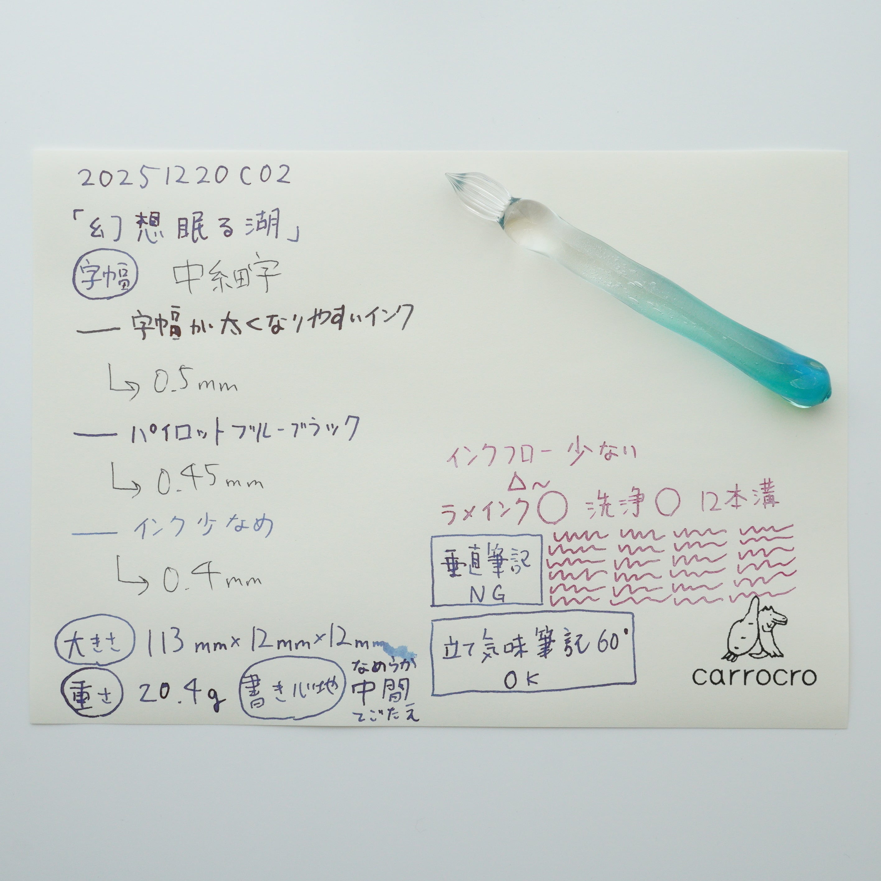 ガラスペンの大きさ、重さ、字幅、試し書き、書き心地などの個体情報を最後の写真に記載しています。書き心地は作家の感想で目安です。試し書きにあるラメインクは「ギター スパークルインキ ベリーパープル」です。