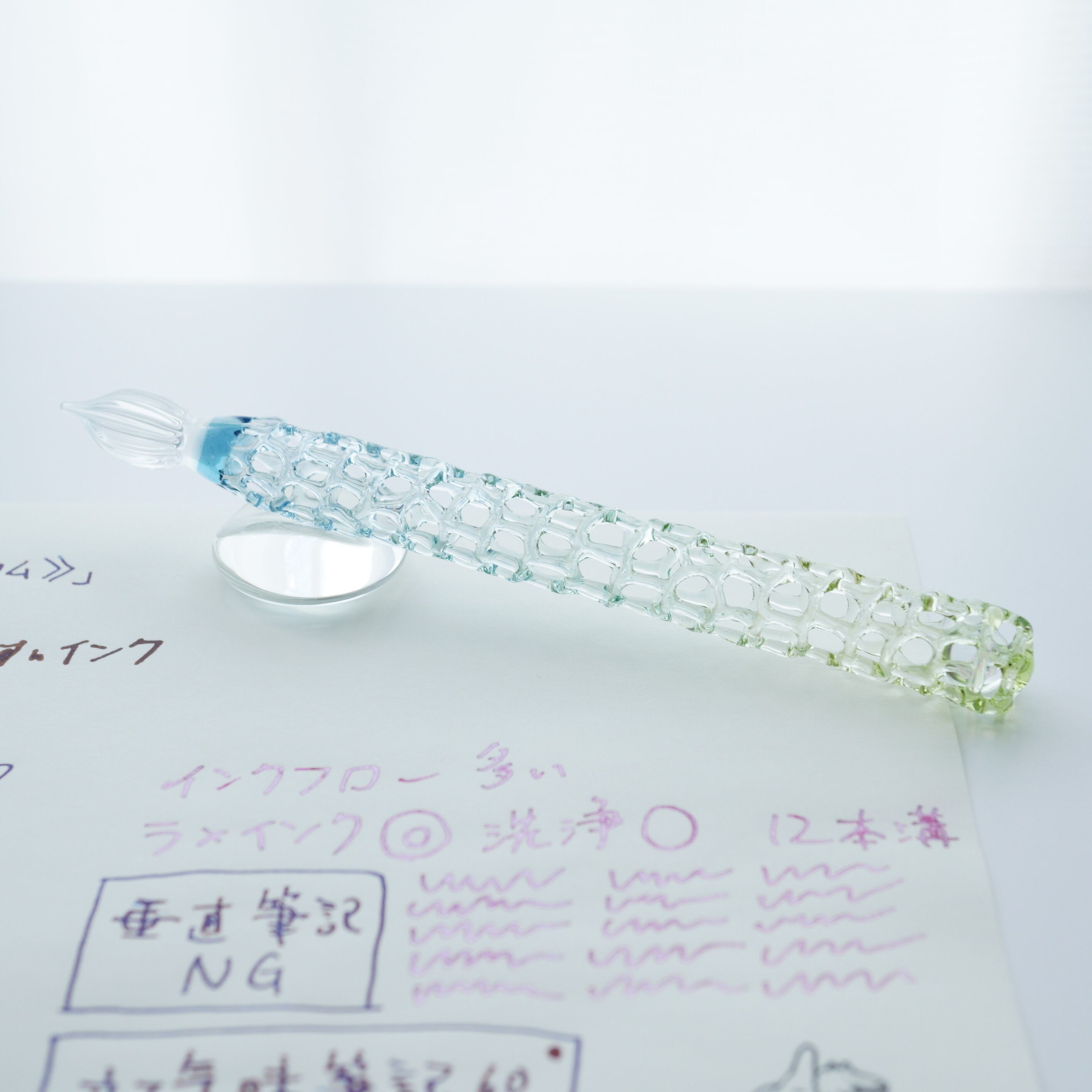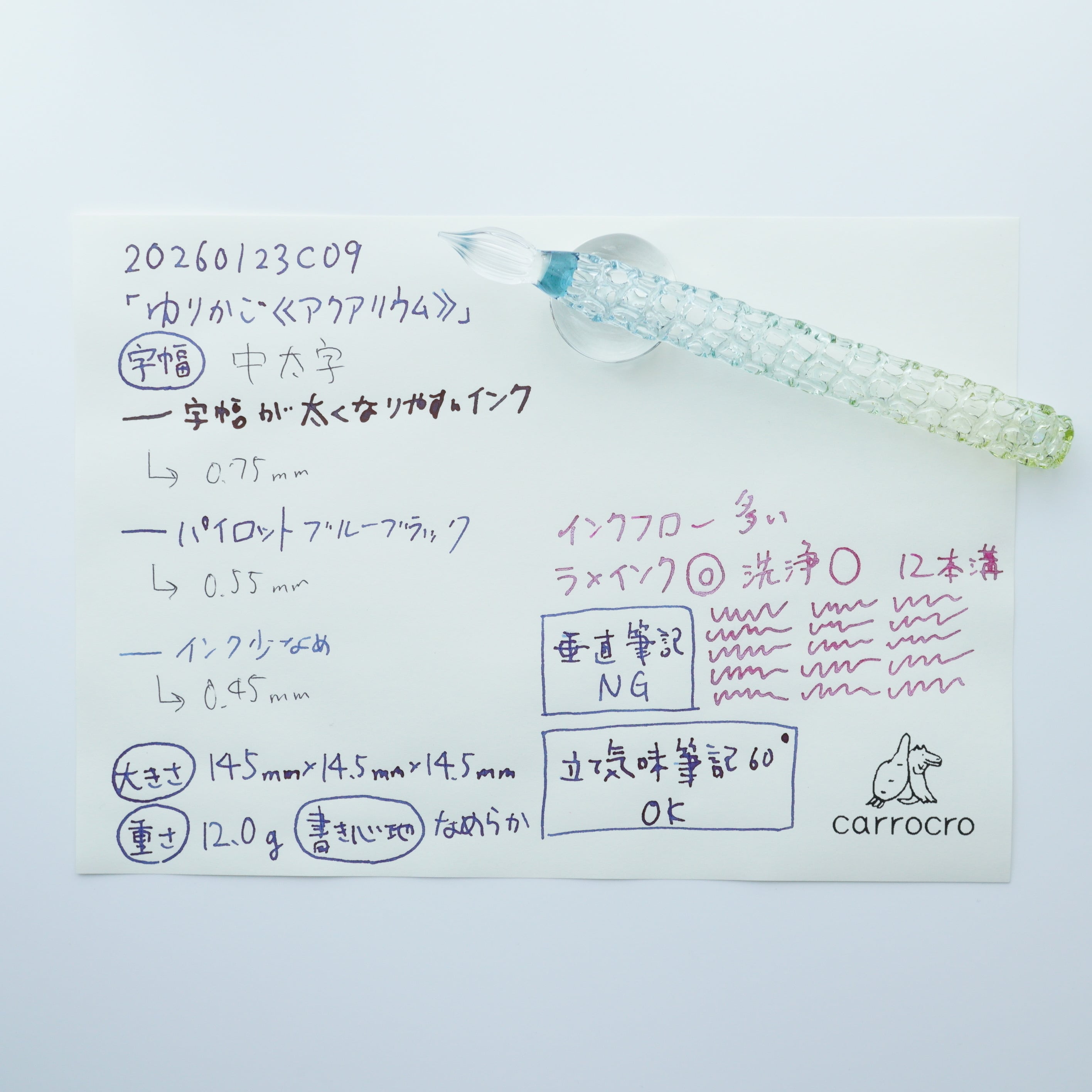 ガラスペンの大きさ、重さ、字幅、試し書き、書き心地などの個体情報を最後の写真に記載しています。書き心地は作家の感想で目安です。試し書きにあるラメインクは「ギター スパークルインキ ベリーパープル」です。