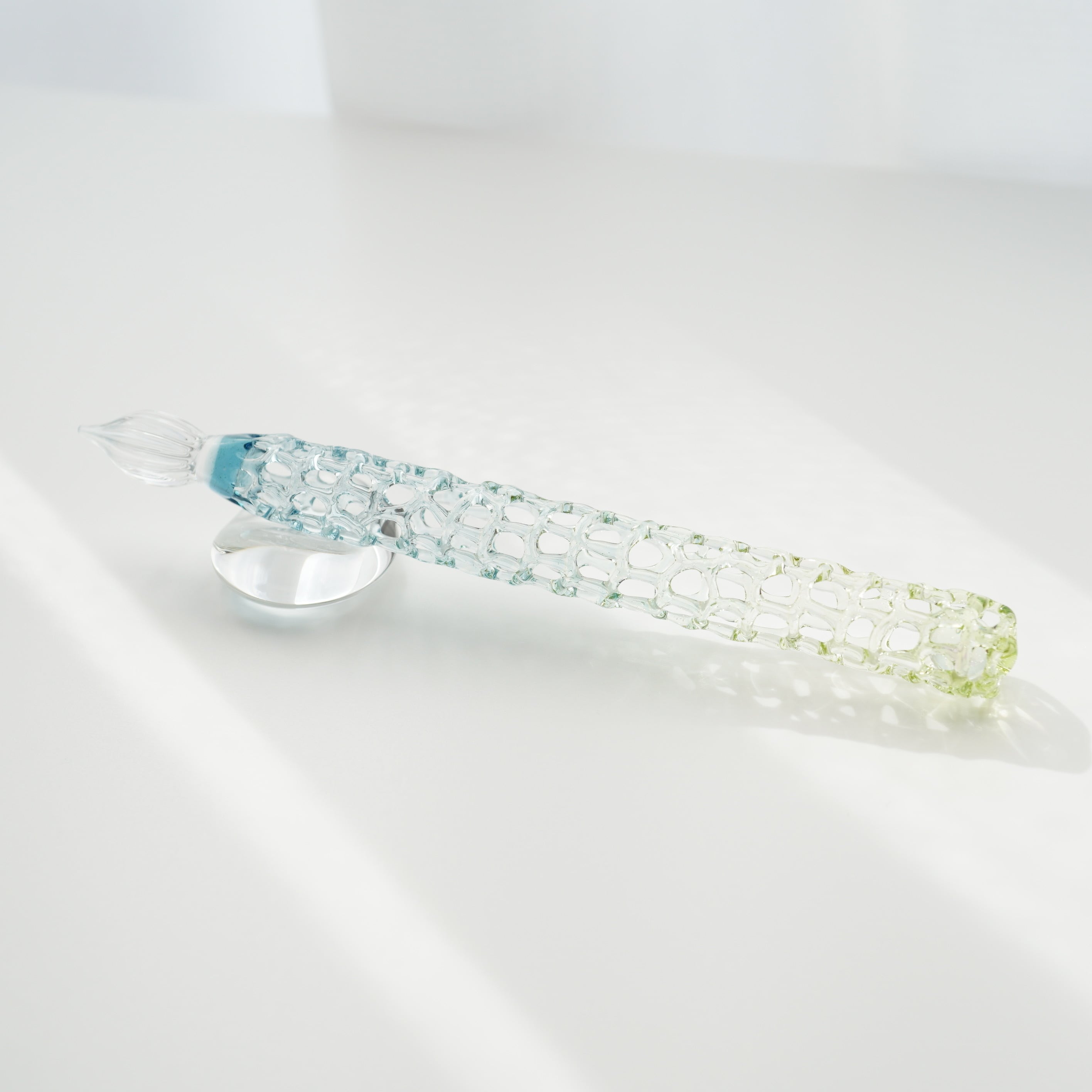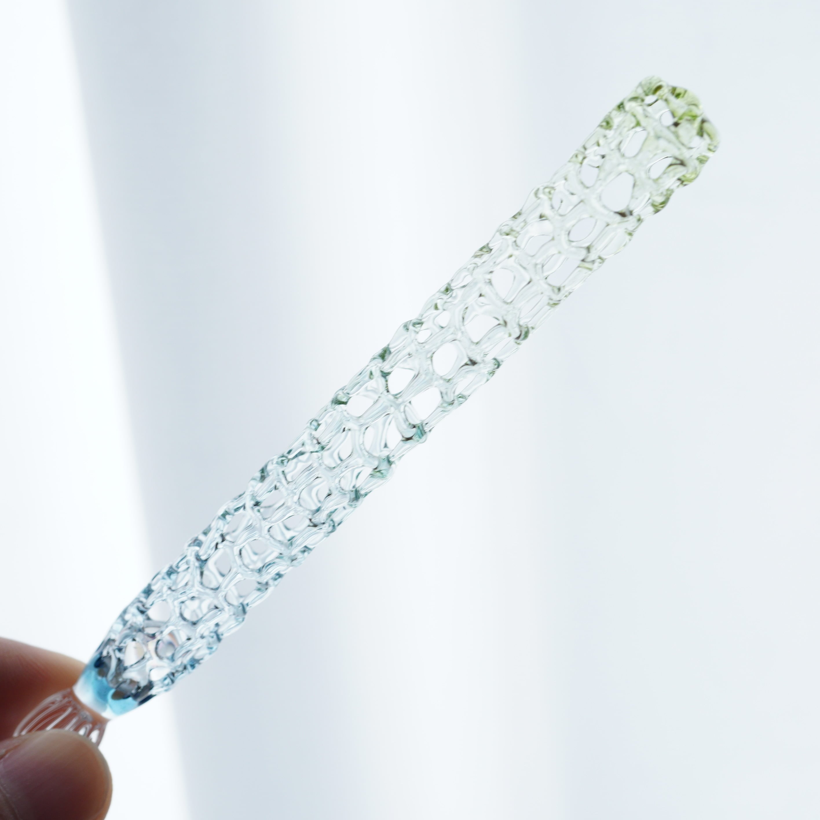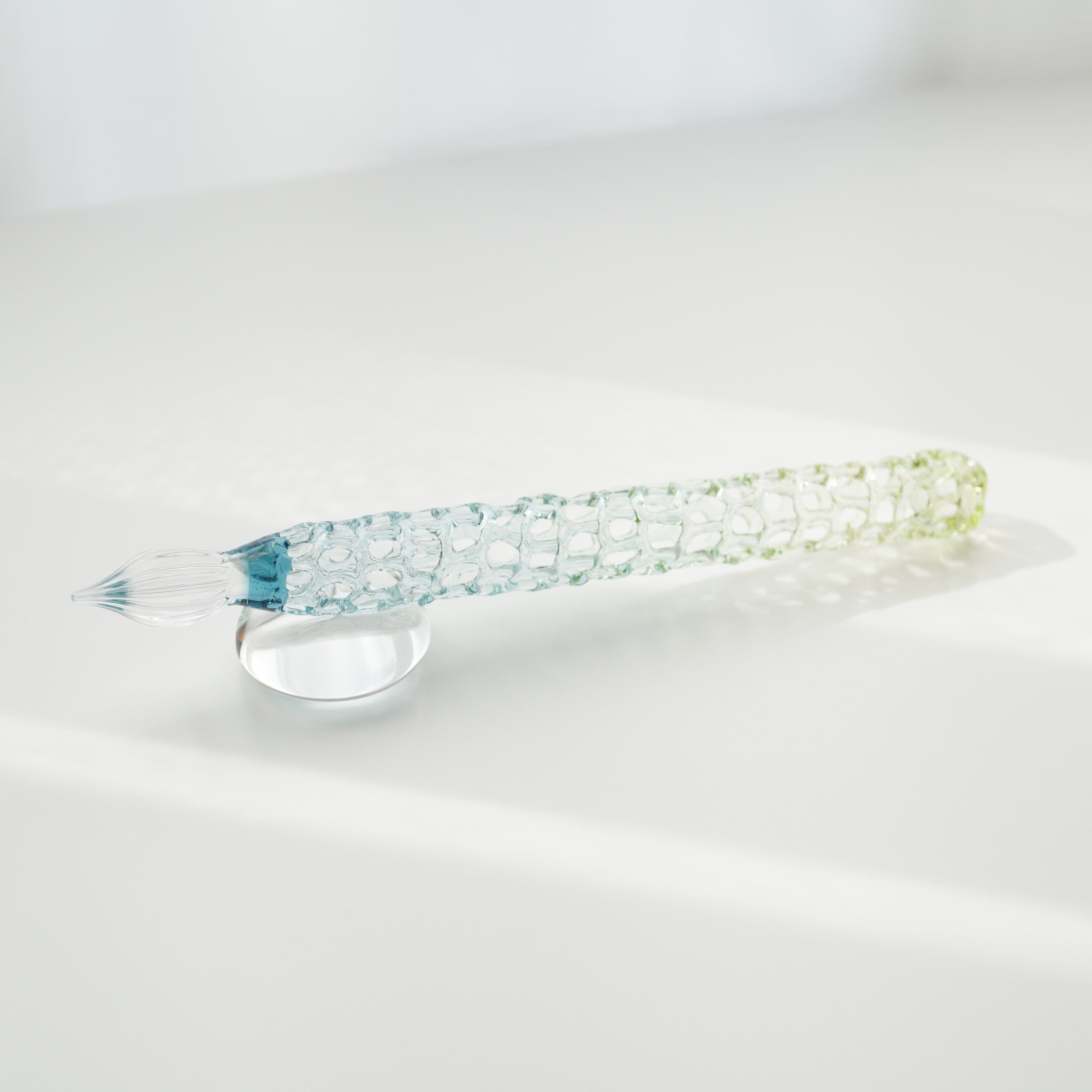 水草の緑と水の色をグラデーションしたゆりかごガラスペンです。あみあみを薄く作っているのでとても軽いです。12gです。