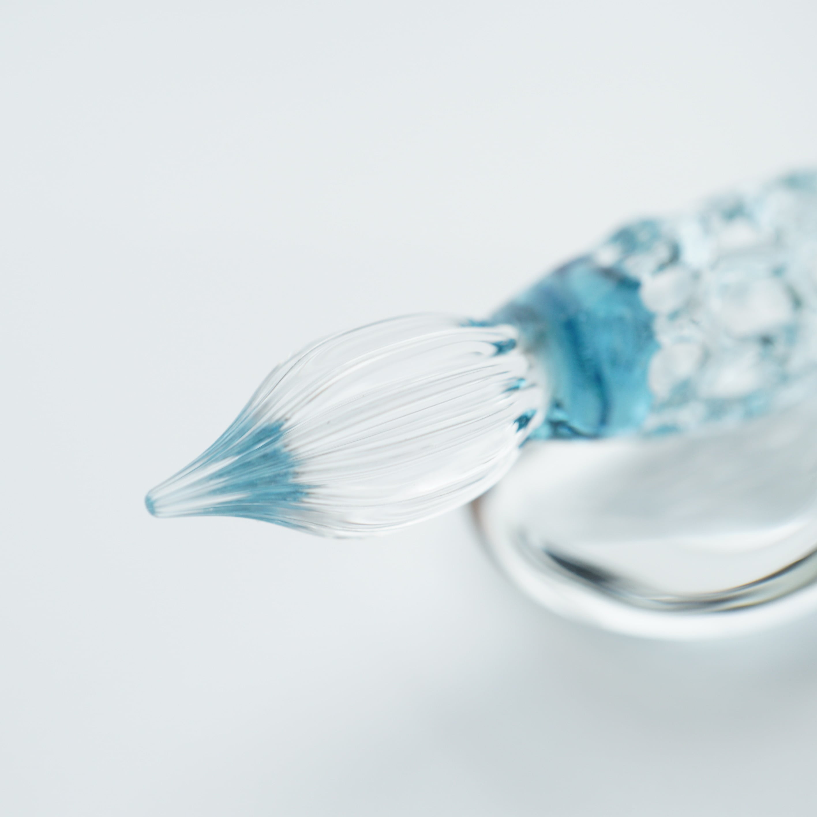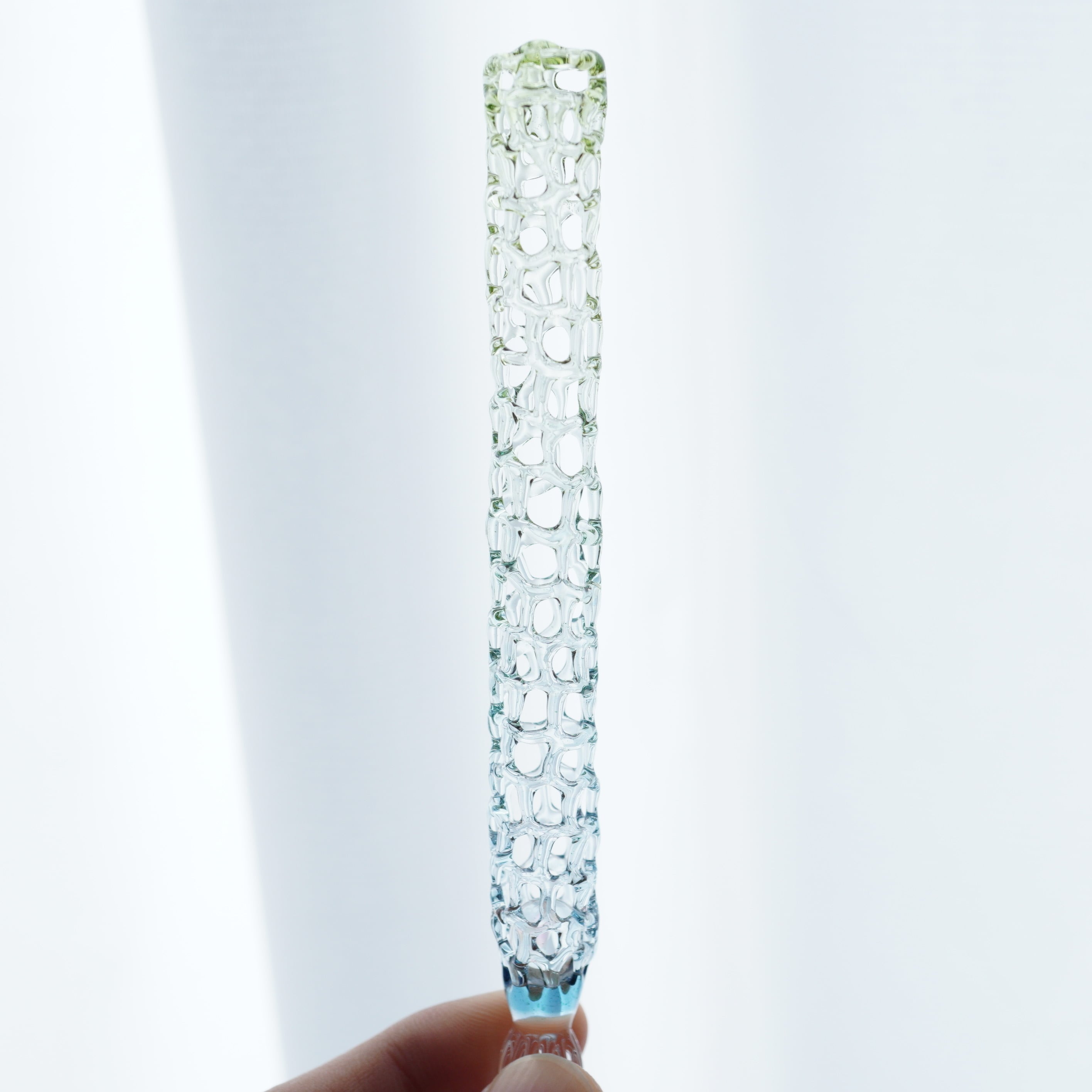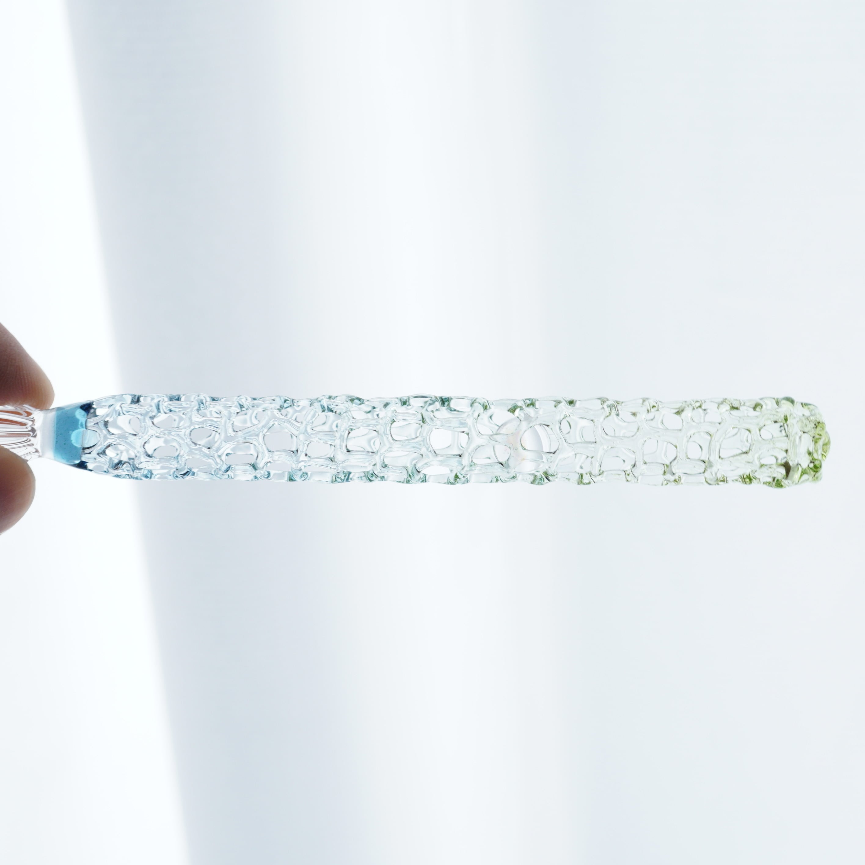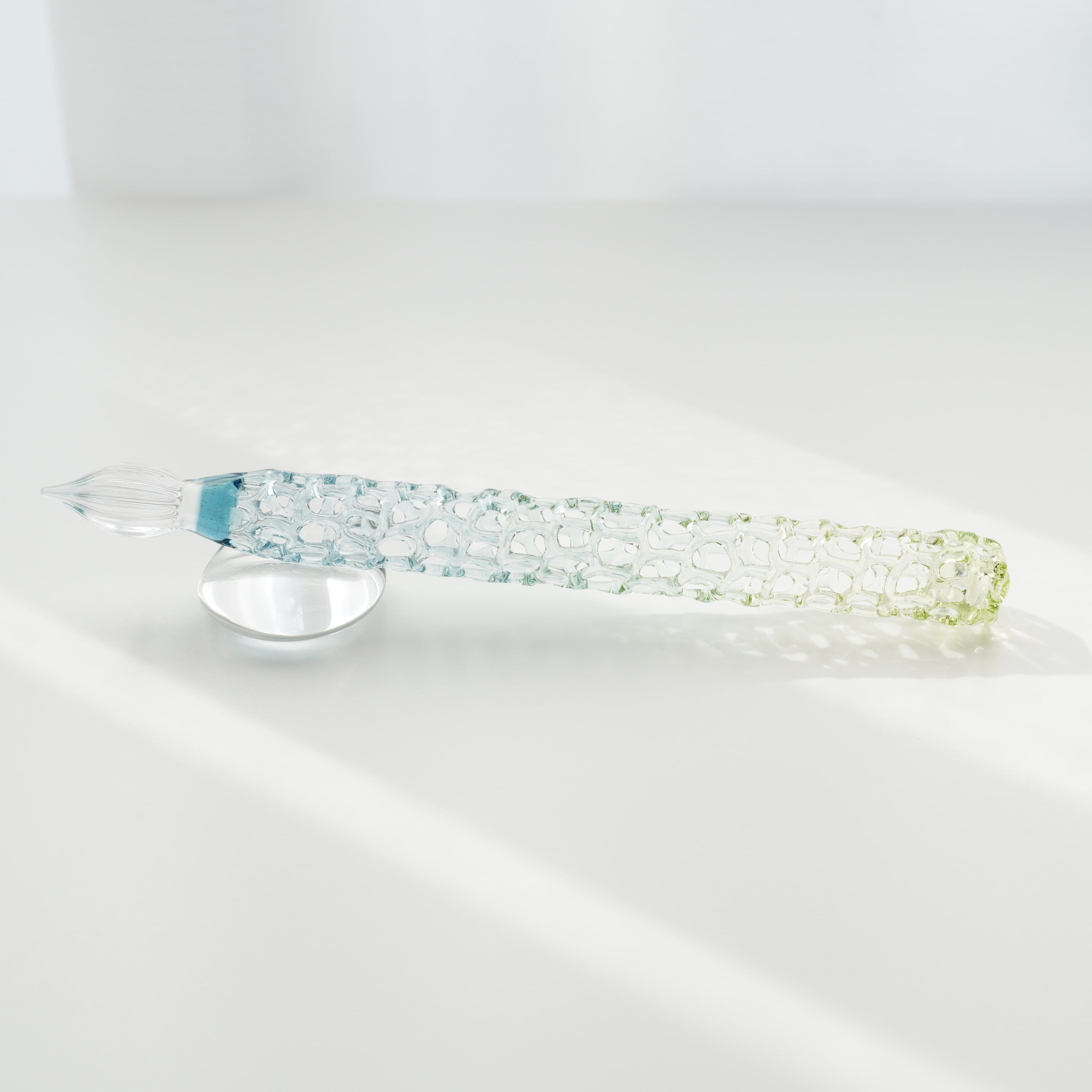 水草の緑と水の色をグラデーションしたゆりかごガラスペンです。あみあみを薄く作っているのでとても軽いです。12gです。