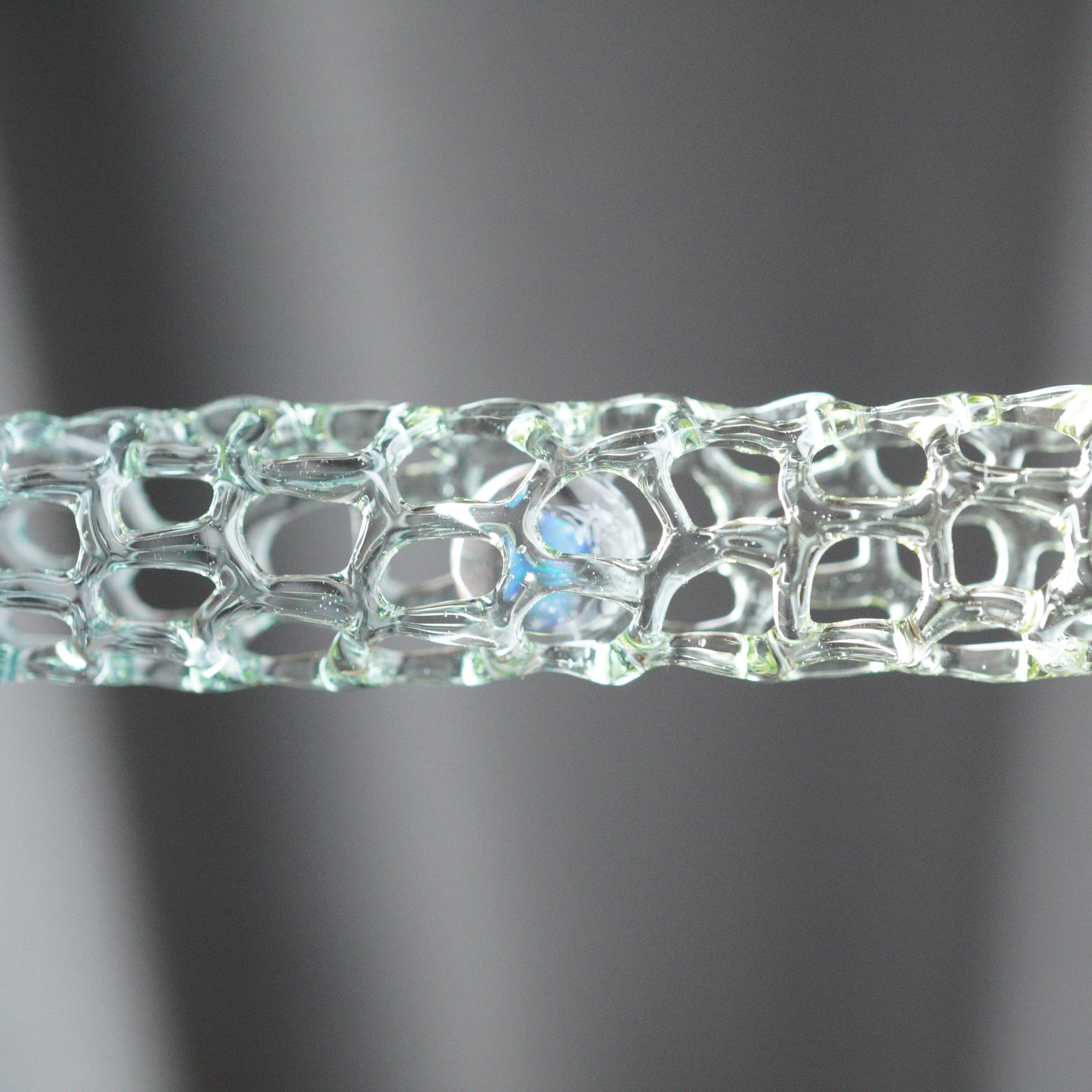 ガラスで作ったあみあみの中にオパールが入ったガラスの珠を入れています。