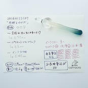 ガラスペンの大きさ、重さ、字幅、試し書き、書き心地などの個体情報を最後の写真に記載しています。書き心地は作家の感想で目安です。試し書きにあるラメインクは「ギター スパークルインキ ベリーパープル」です。