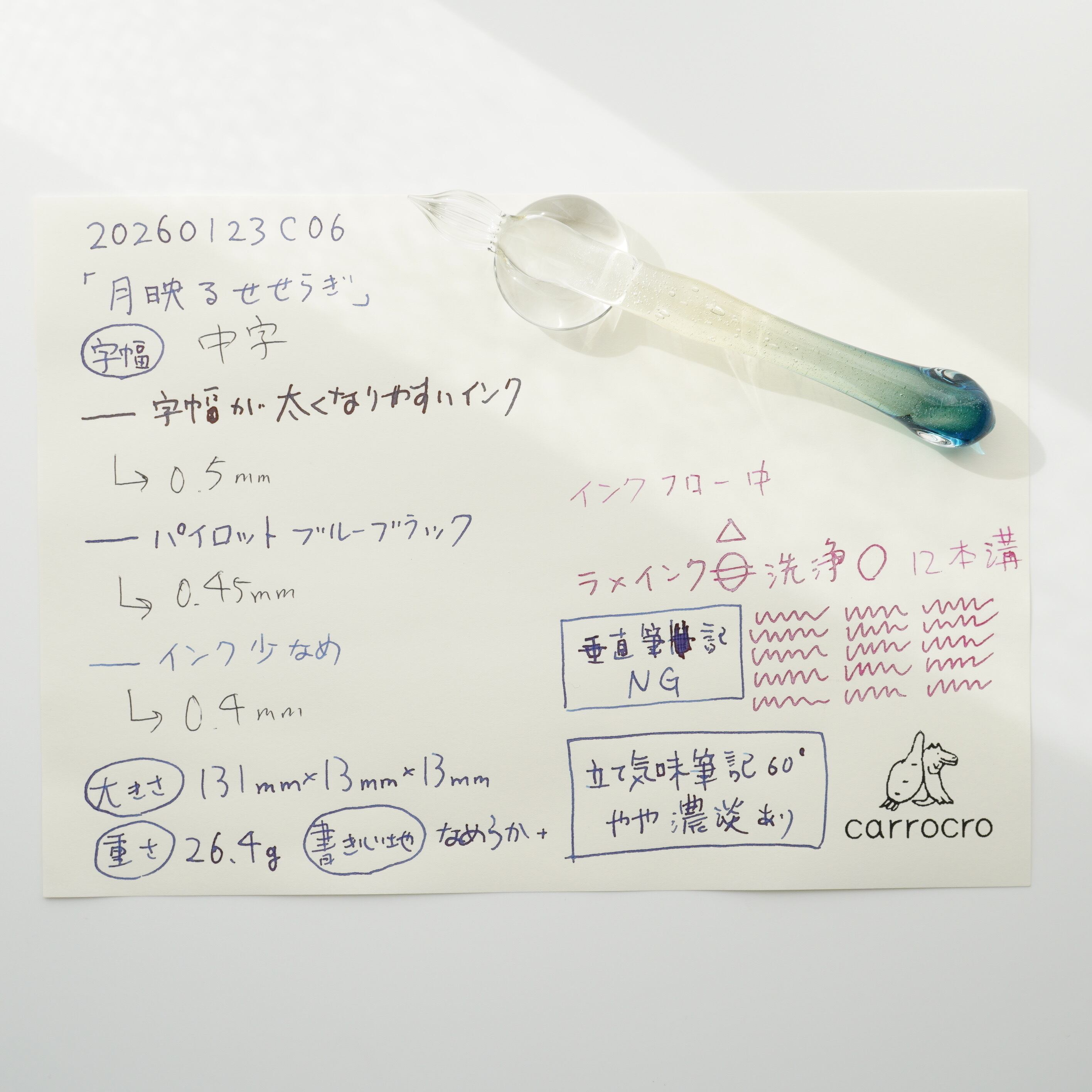 ガラスペンの大きさ、重さ、字幅、試し書き、書き心地などの個体情報を最後の写真に記載しています。書き心地は作家の感想で目安です。試し書きにあるラメインクは「ギター スパークルインキ ベリーパープル」です。