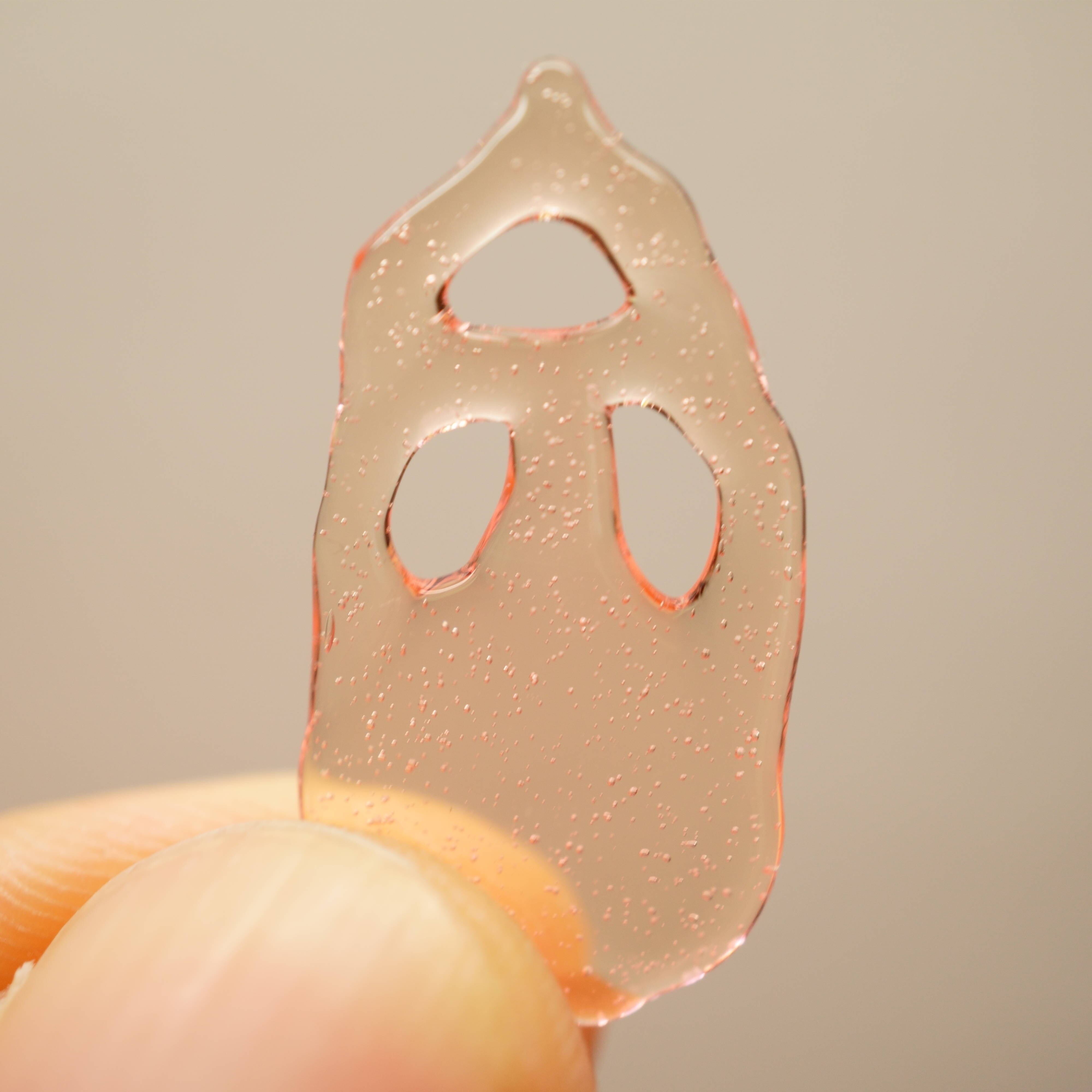 使っている黄色いガラスは蛍光灯や白熱球の光でピンク色に変わって見えます。