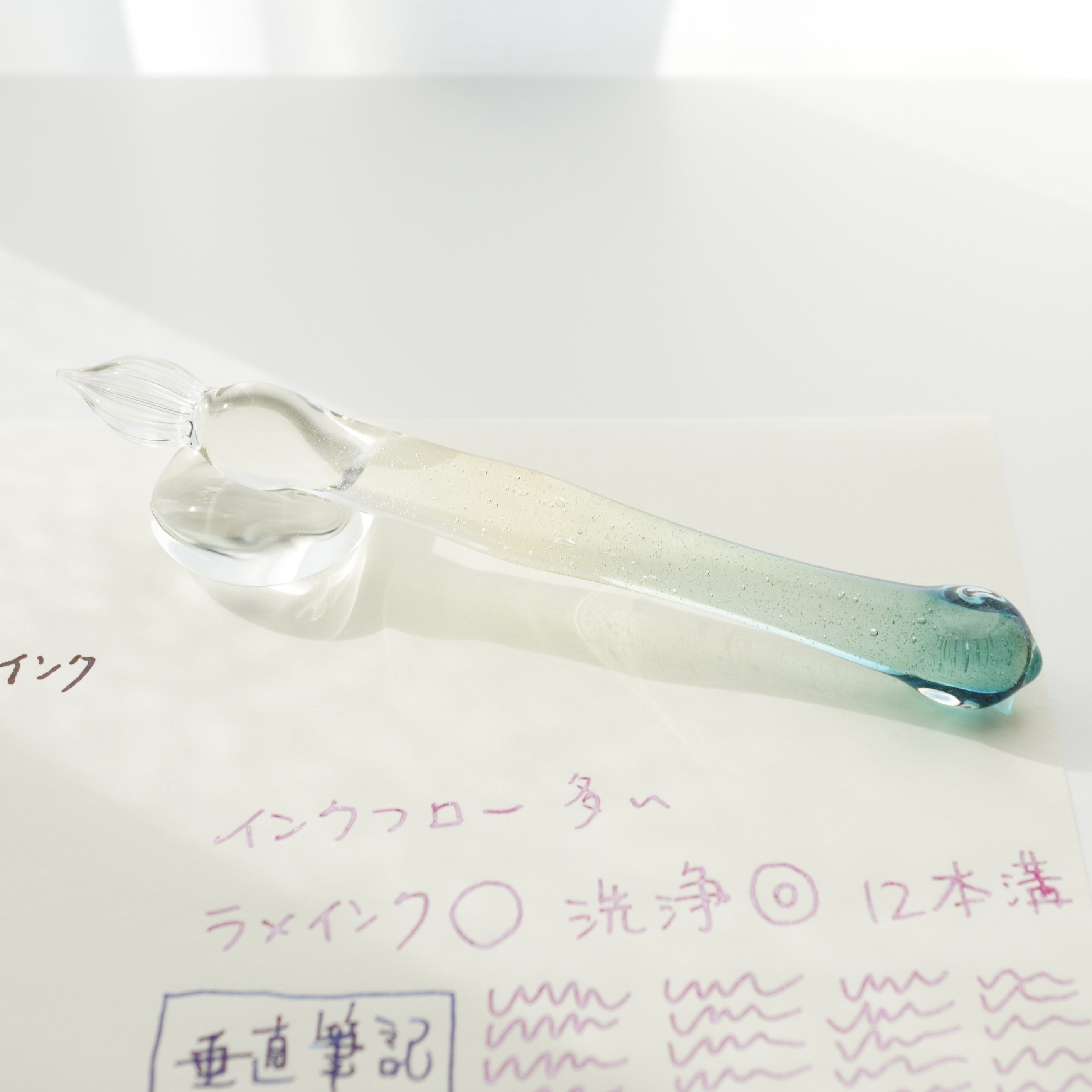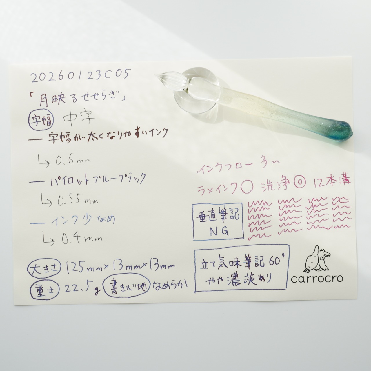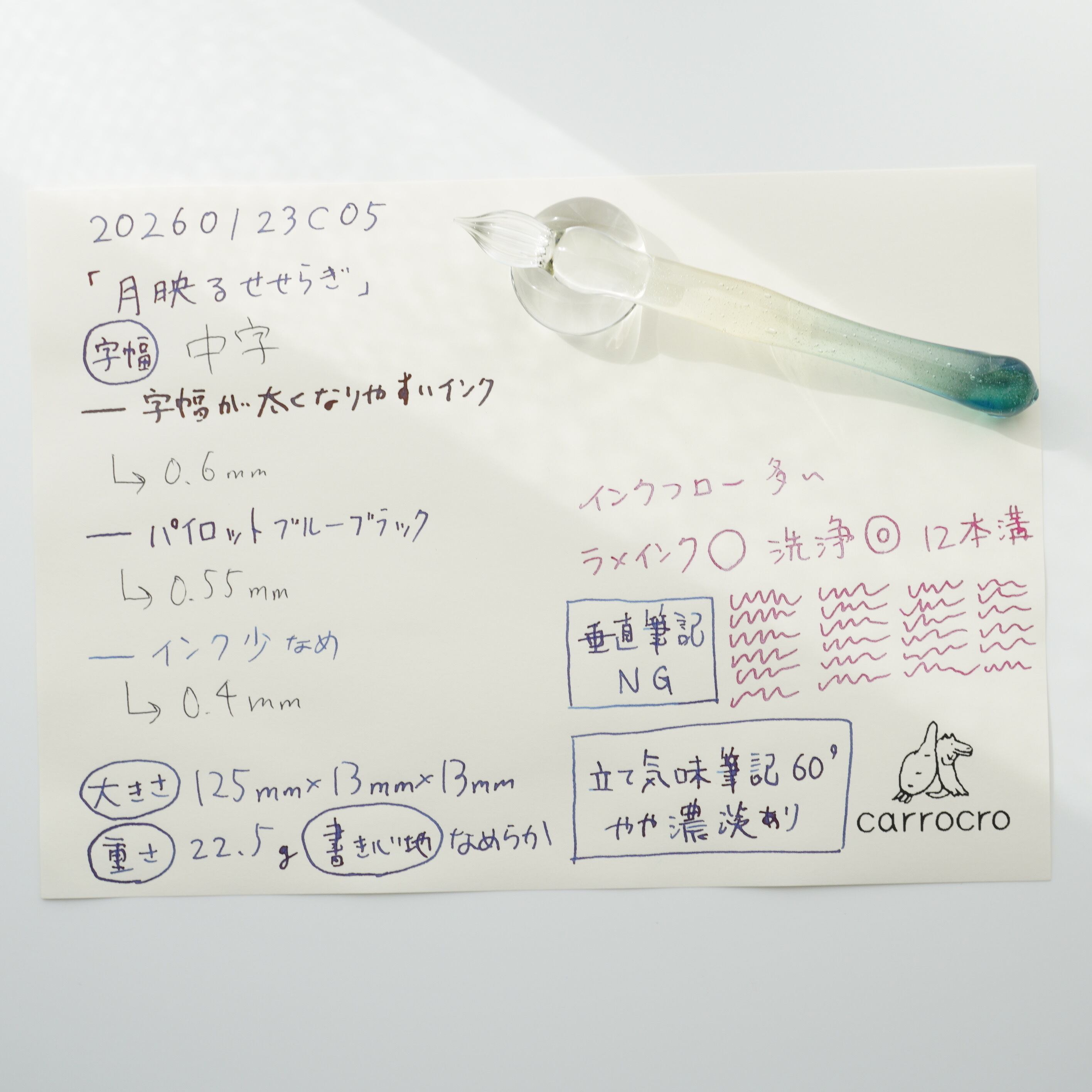 ガラスペンの大きさ、重さ、字幅、試し書き、書き心地などの個体情報を最後の写真に記載しています。書き心地は作家の感想で目安です。試し書きにあるラメインクは「ギター スパークルインキ ベリーパープル」です。