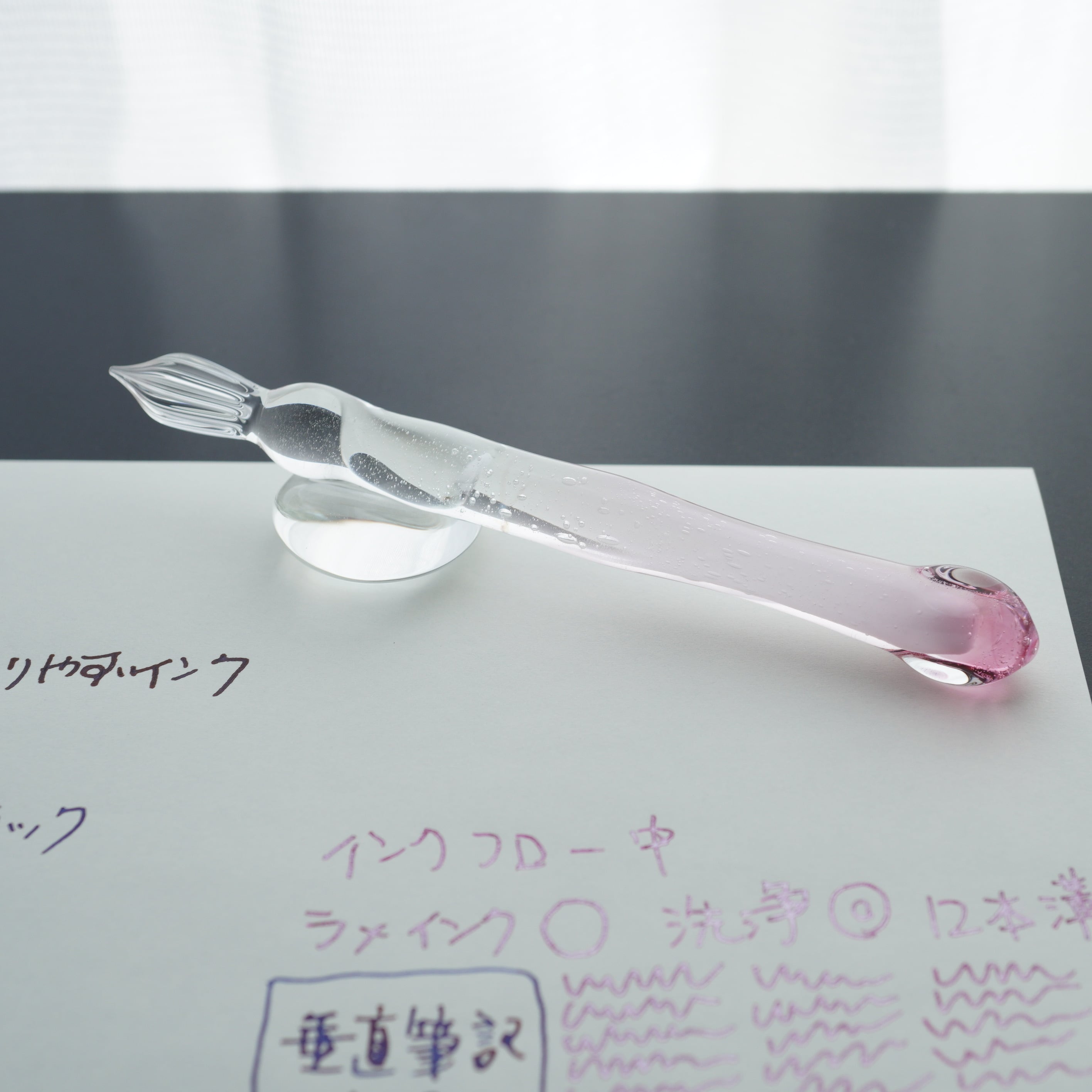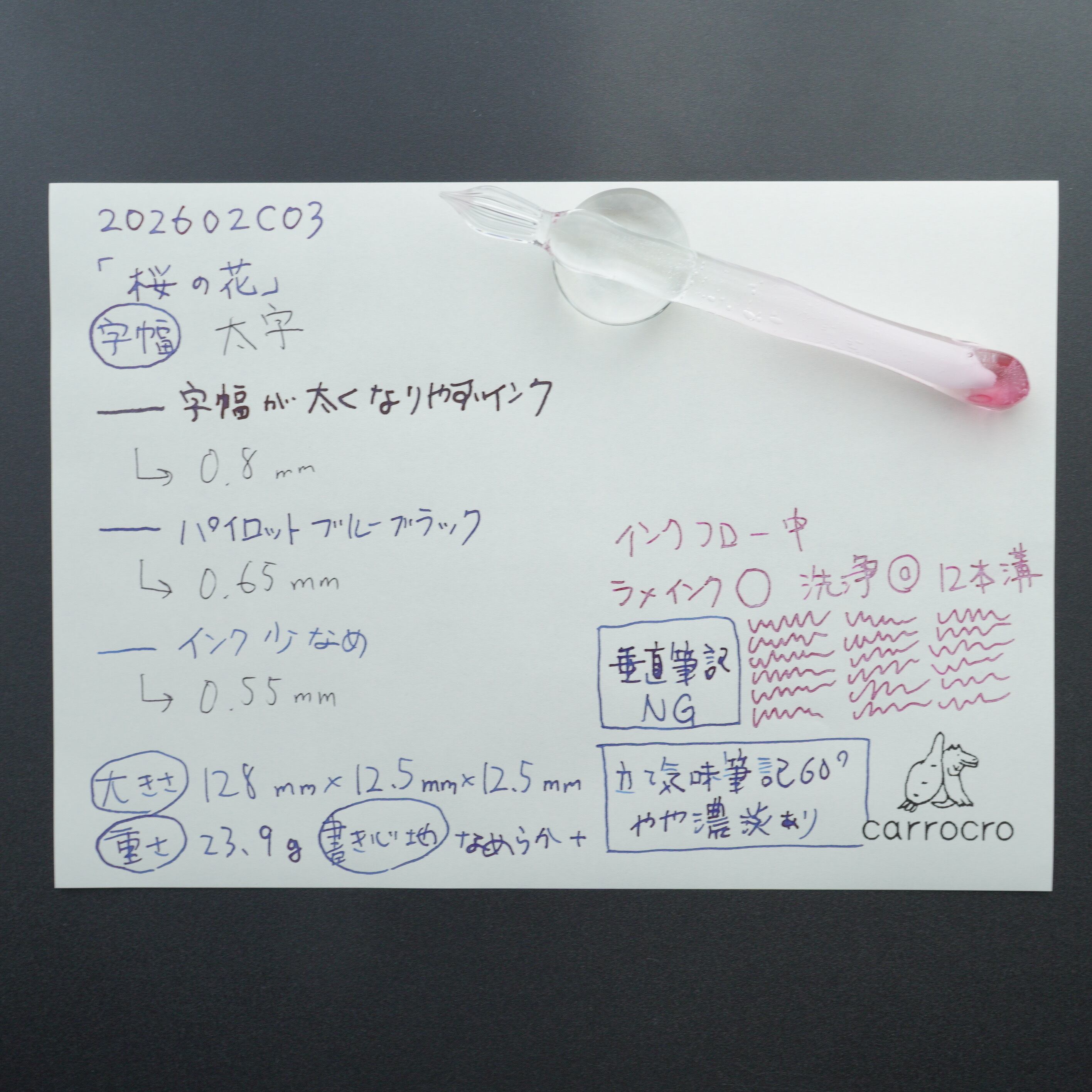 ガラスペンの大きさ、重さ、字幅、試し書き、書き心地などの個体情報を最後の写真に記載しています。書き心地は作家の感想で目安です。試し書きにあるラメインクは「ギター スパークルインキ ベリーパープル」です。