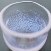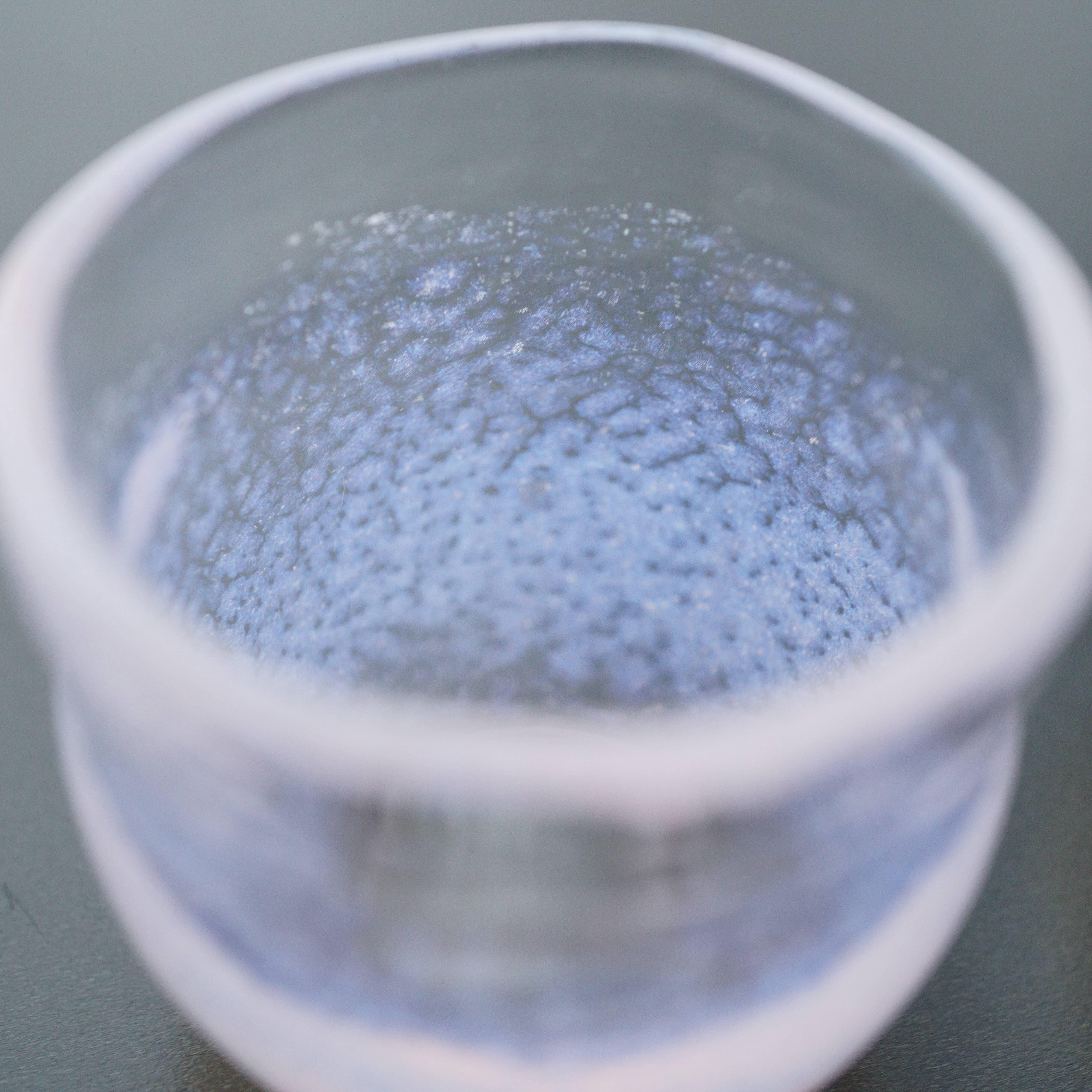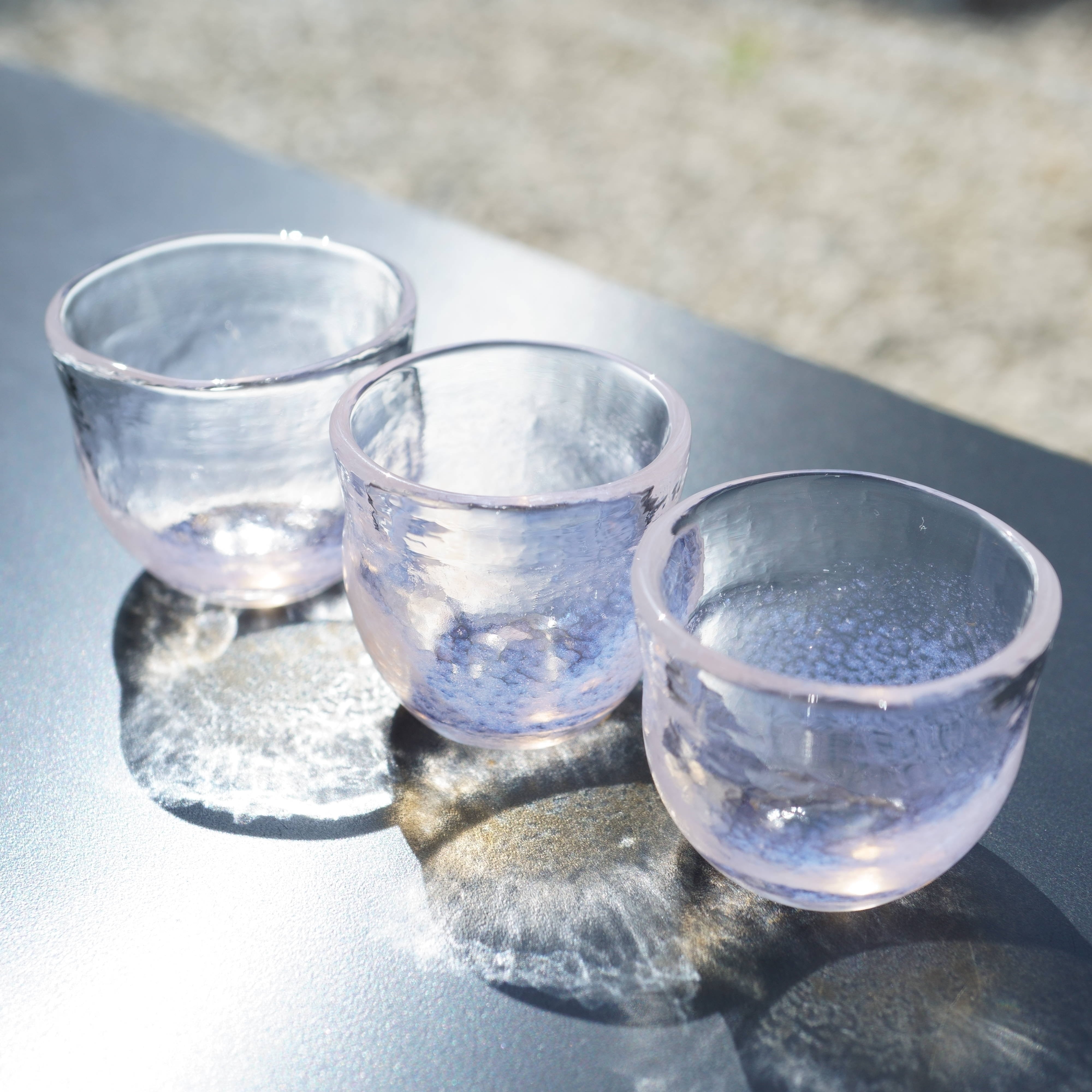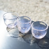 耐熱ガラスで器を作るときは通常ガラス管を用いて製作しますが、きゃろくろの作品は吹きガラスの要領で溶けたガラスの塊を吹いて作っています。そのため、ガラスの厚みに微妙な変化が生まれ温かみのある器になっています。