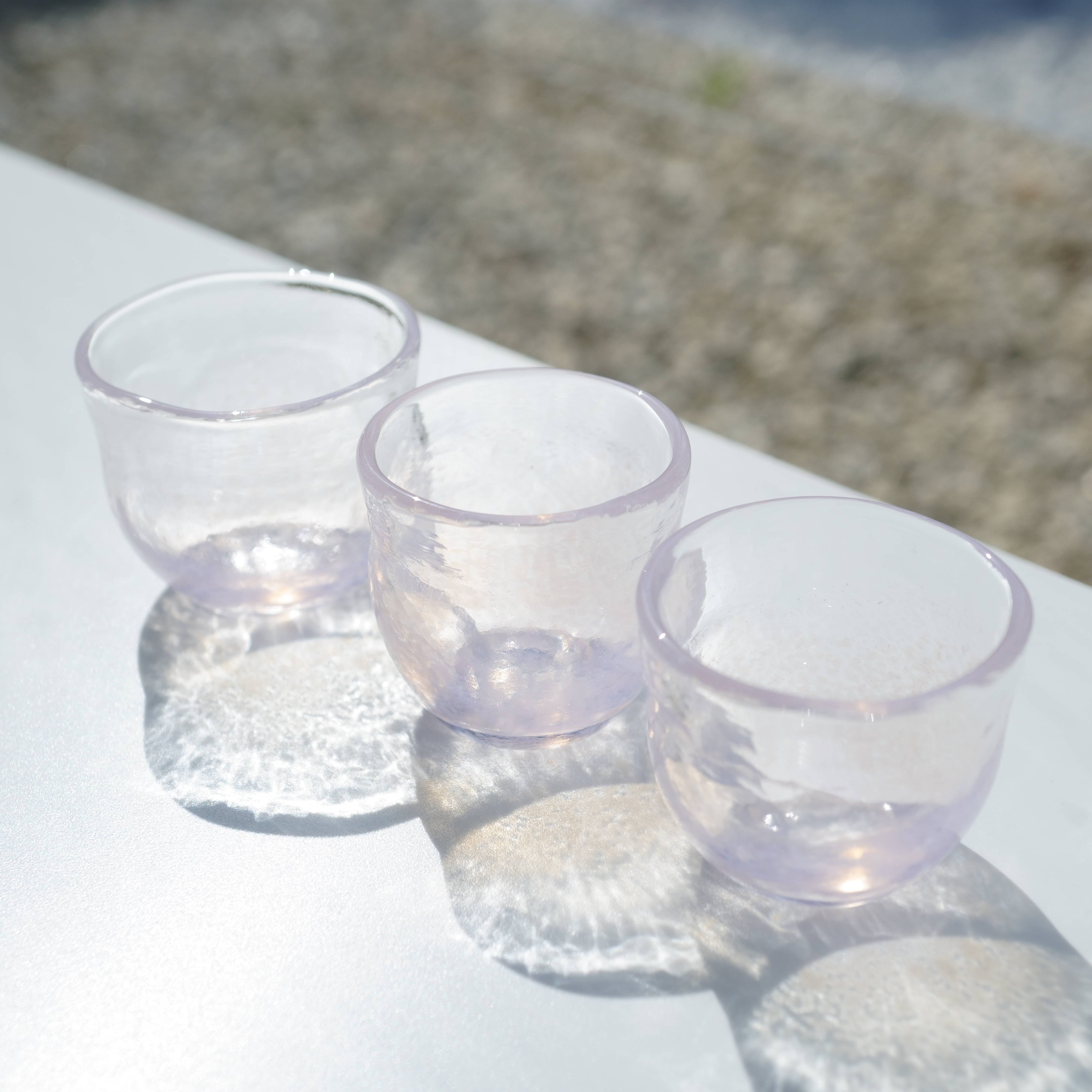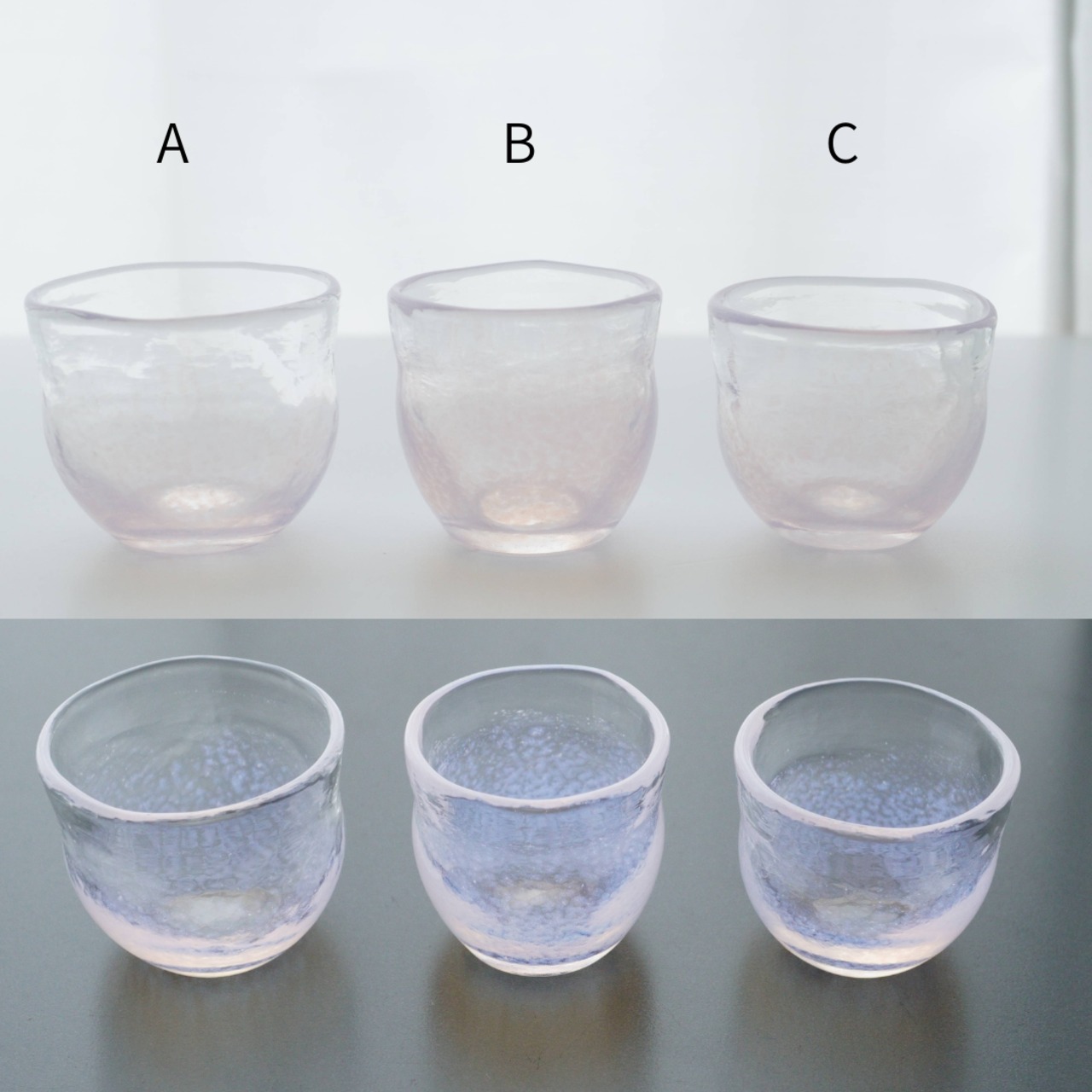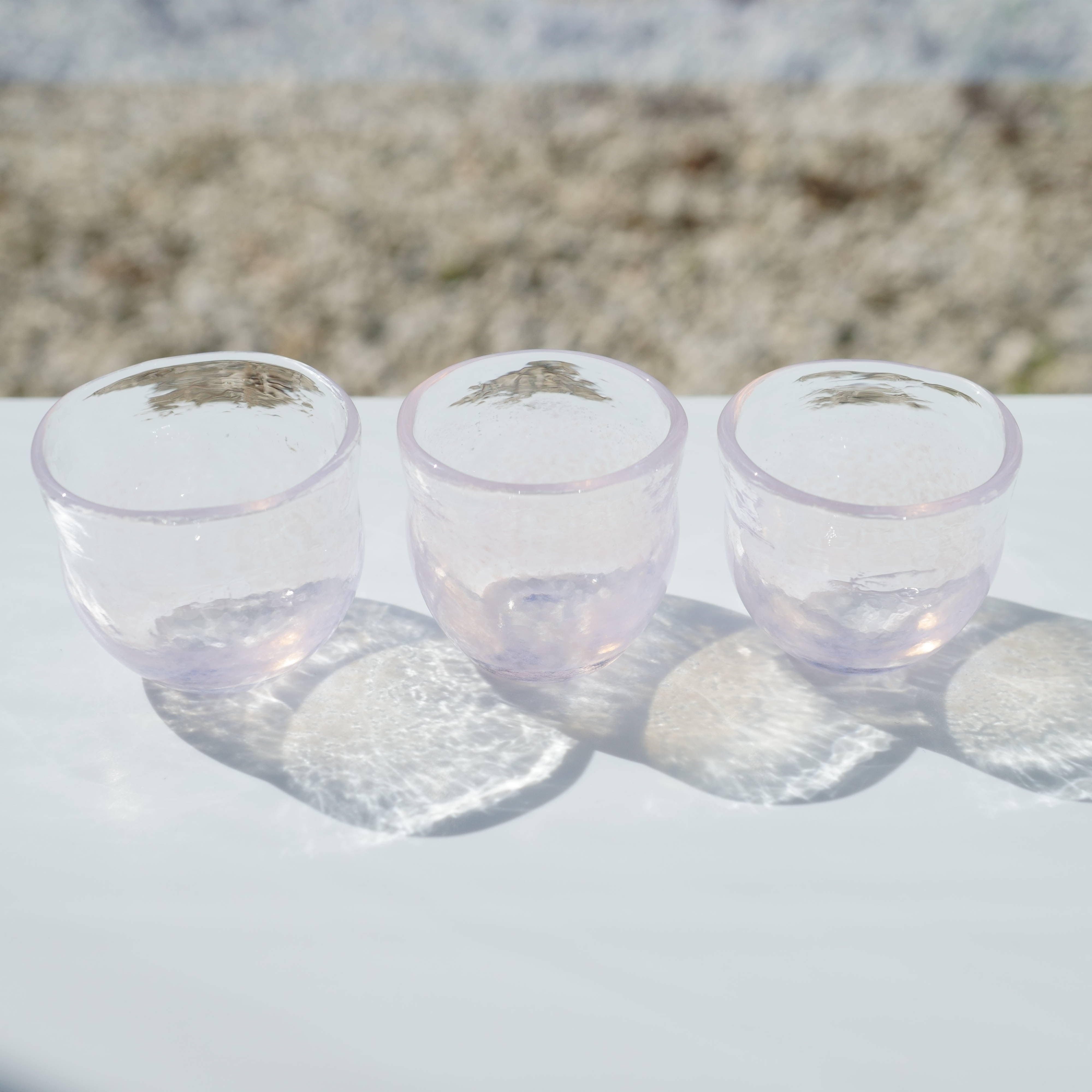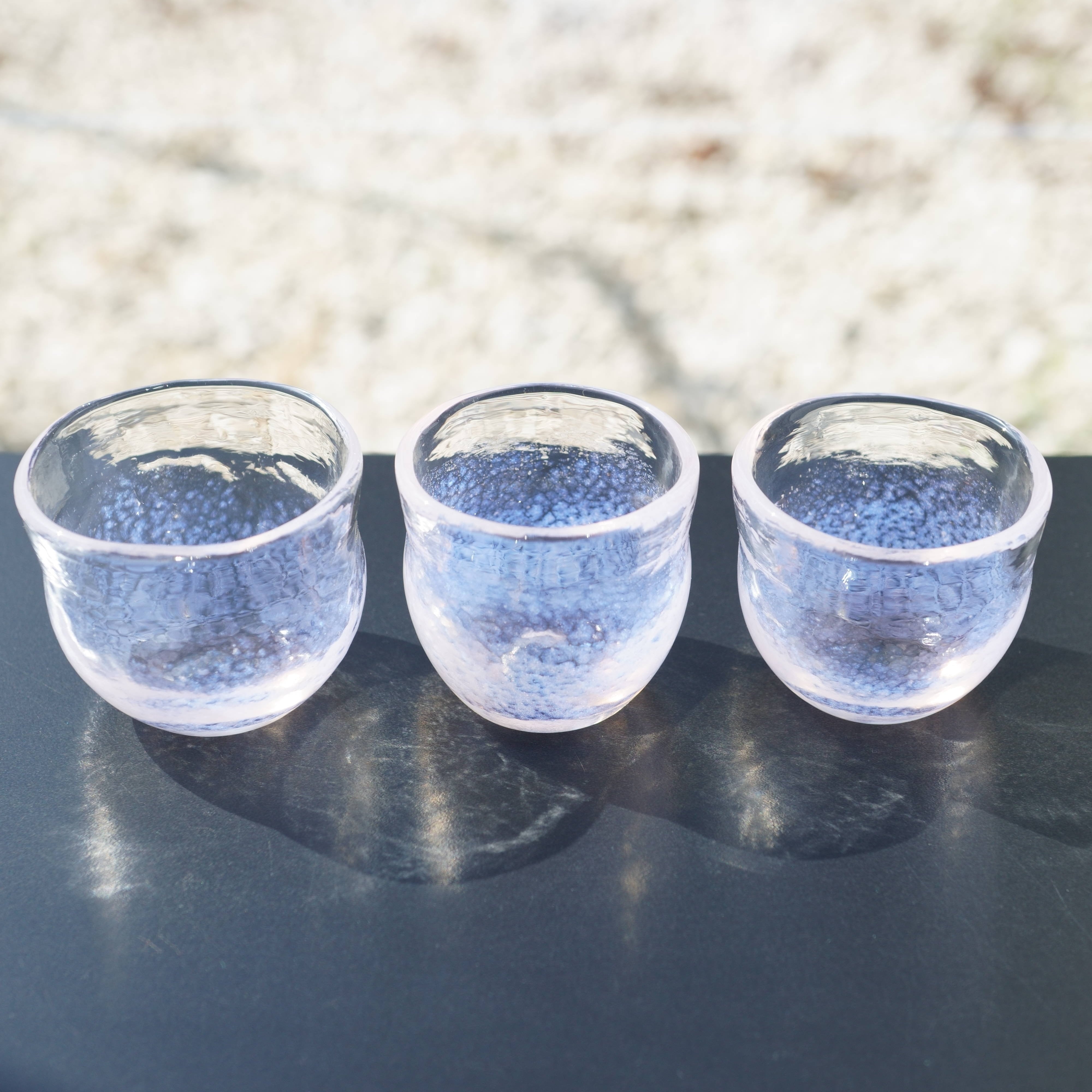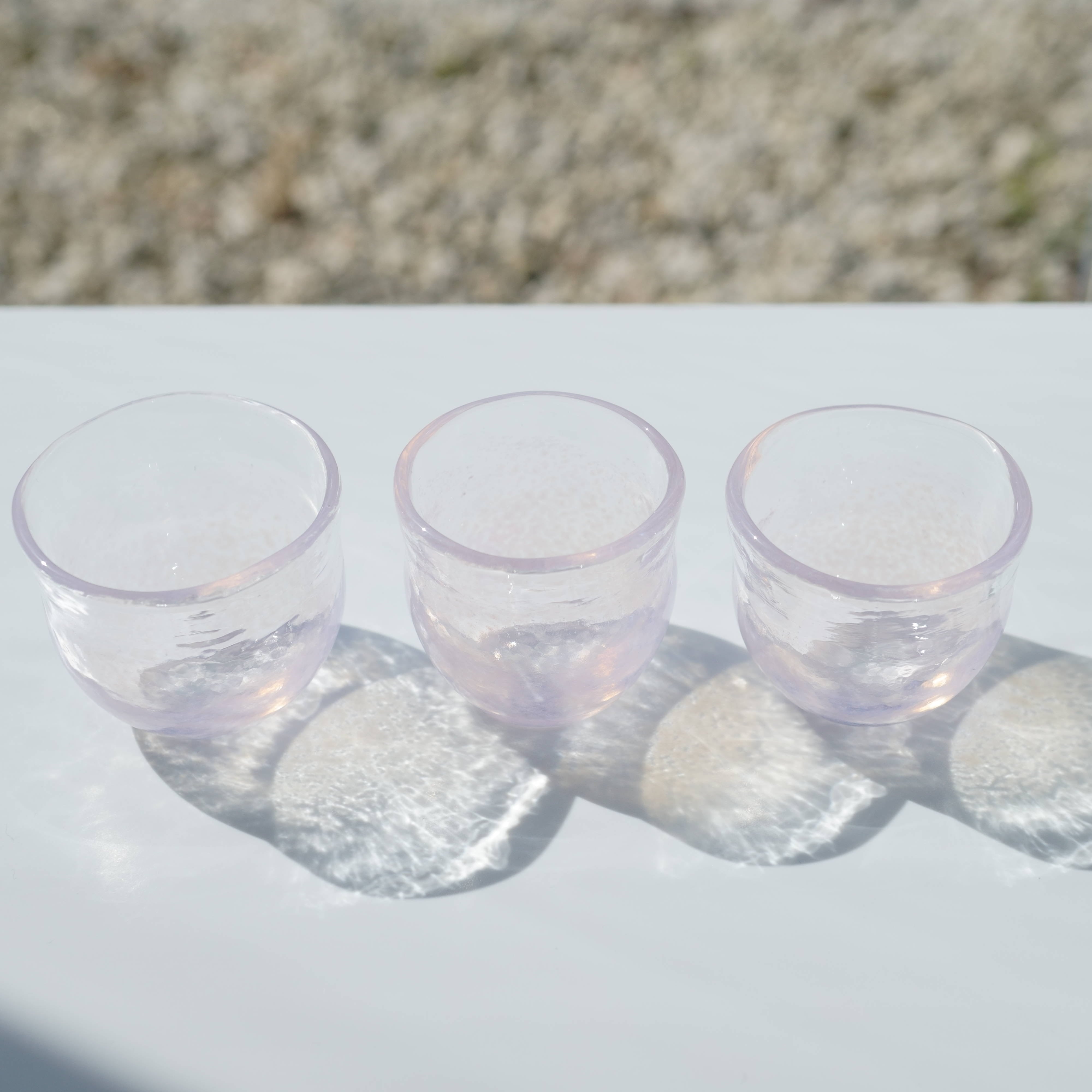 耐熱ガラスを使って製作した桜色のおちょこです。桜色は白背景と黒背景で色味が少し変わります。