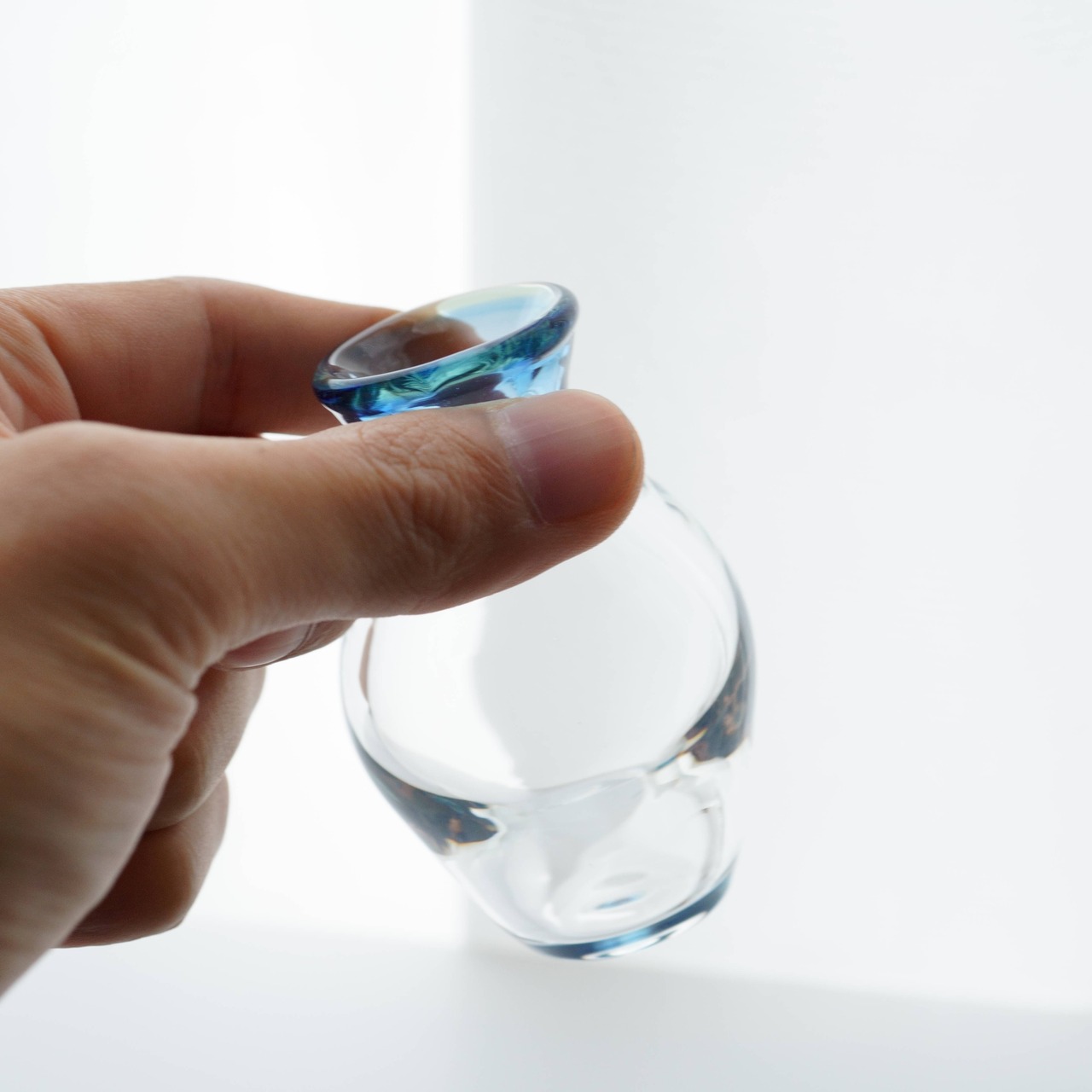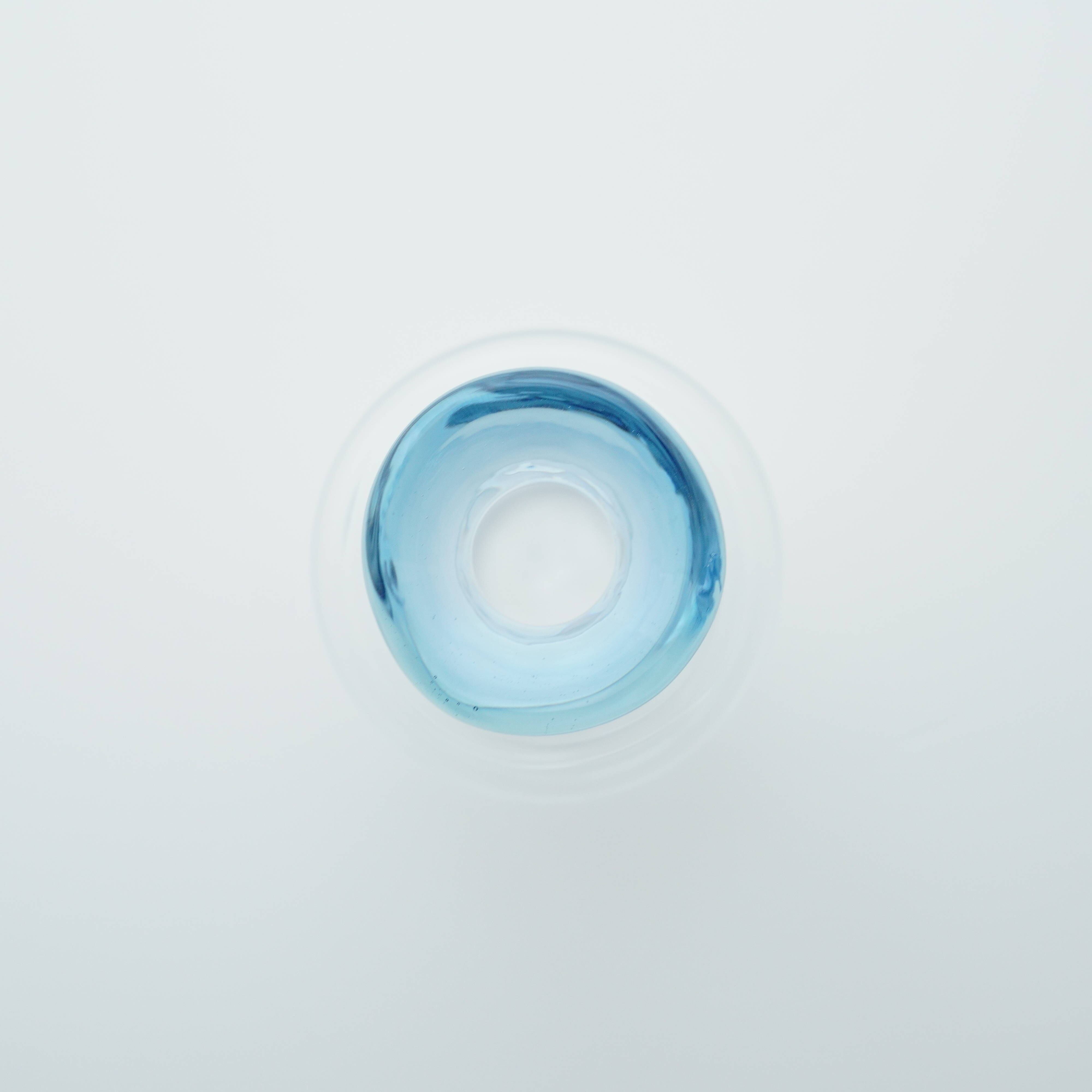 耐熱ガラスで器を作るときは通常ガラス管を用いて製作しますが、きゃろくろの作品は吹きガラスの要領で溶けたガラスの塊を吹いて作っています。そのため、ガラスの厚みに微妙な変化が生まれ温かみのある器になっています。