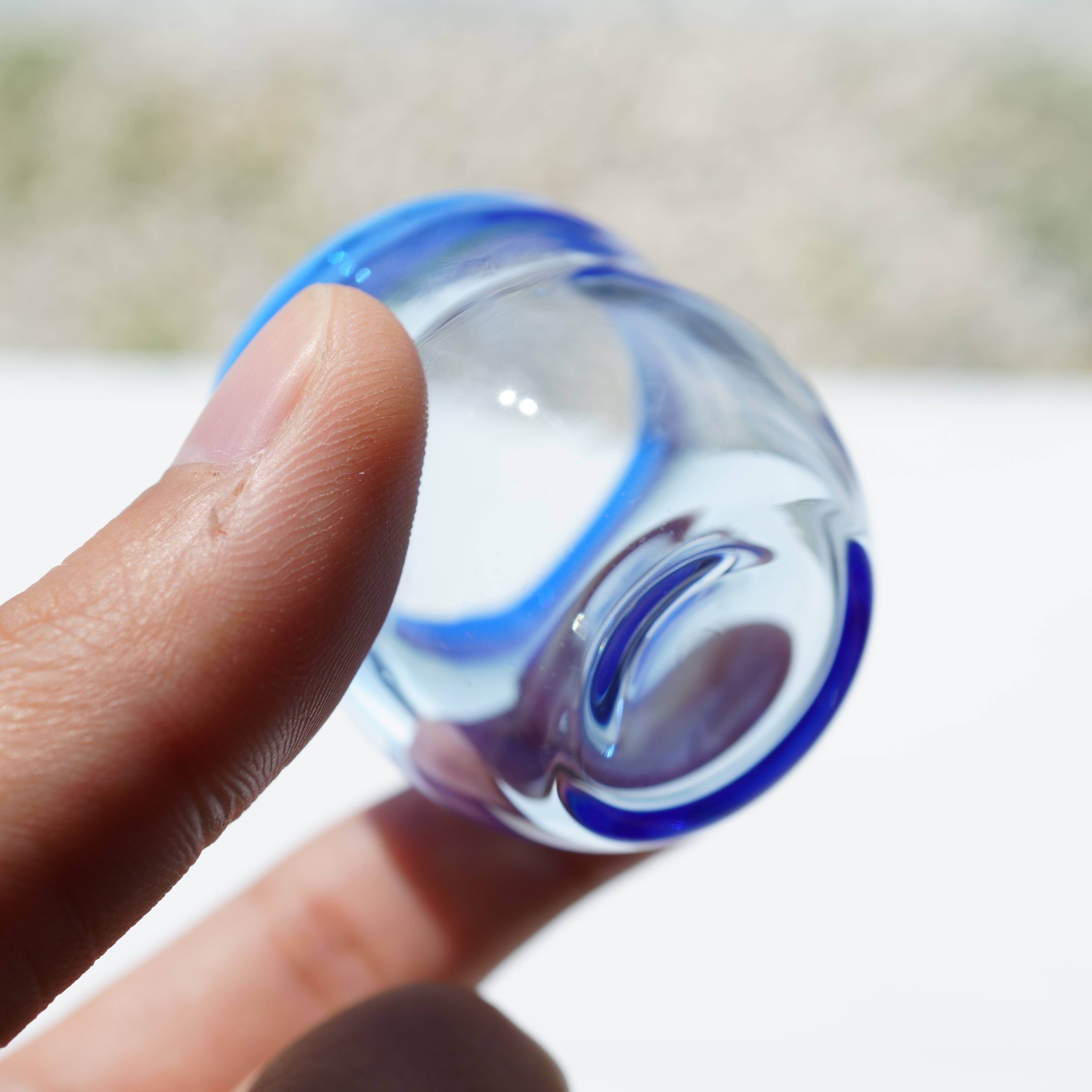 耐熱ガラスで器を作るときは通常ガラス管を用いて製作しますが、きゃろくろの作品は吹きガラスの要領で溶けたガラスの塊を吹いて作っています。ガラス管より色を自由に使えるのが強みですが難しい技法です。貴重な品ですがお試しでお買い得にしています。