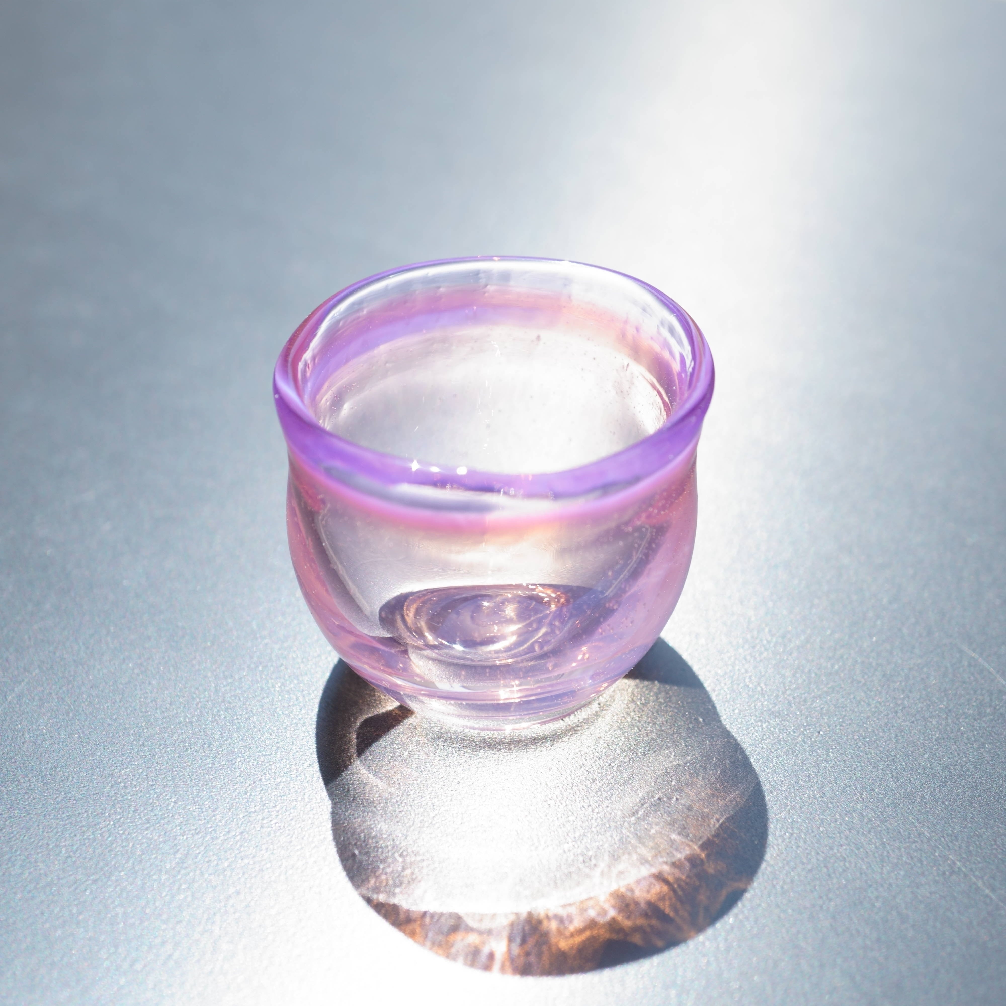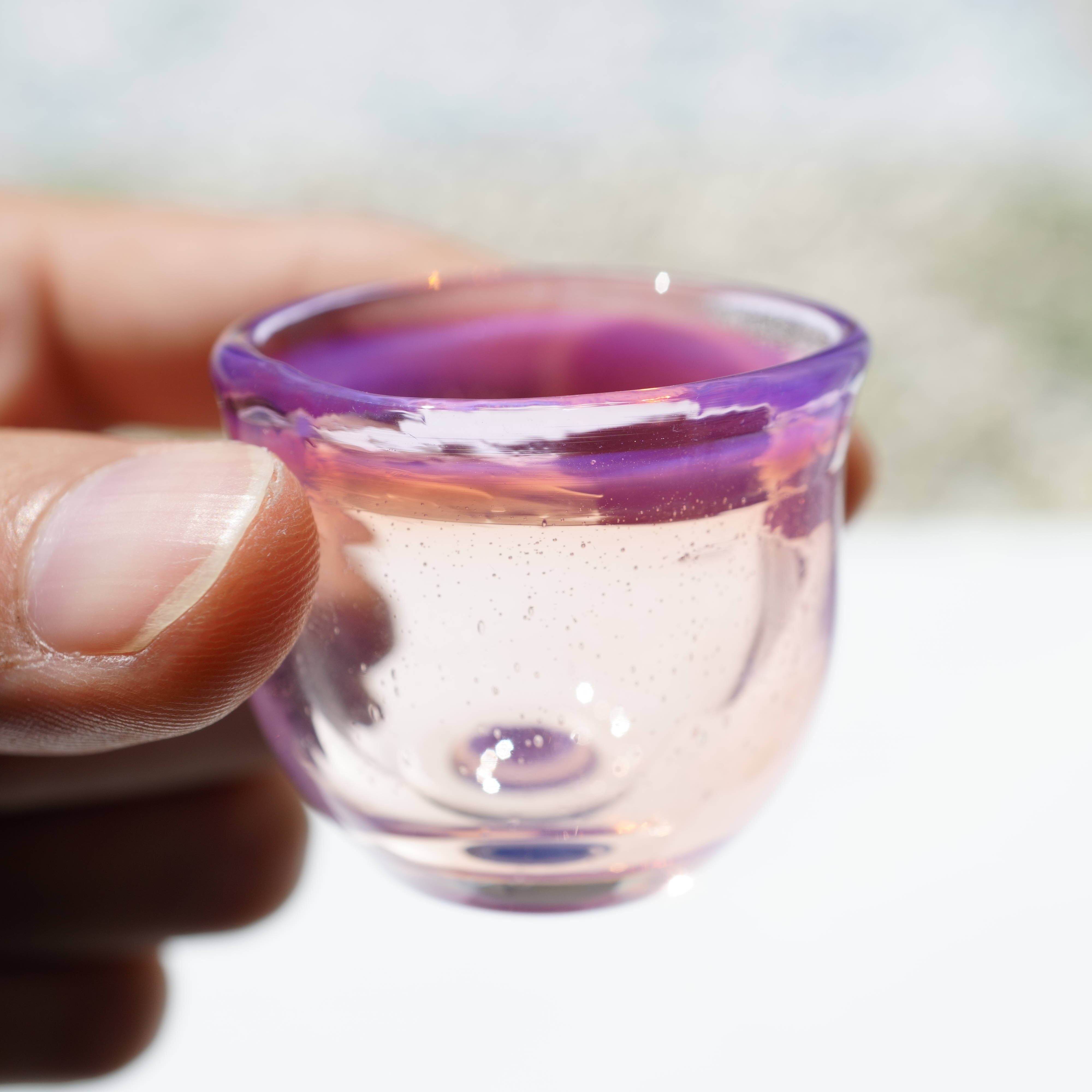 耐熱ガラスを使って製作したカラフルなおちょこです。この作品に使っている黄色の透明ガラスは光源によって色が変わります。太陽光やLEDライトでは写真の色に、白熱電球、蛍光灯でピンク色に見えます。(黄色いガラスを使っていますが赤色を重ねているのでオレンジ色に見えています)