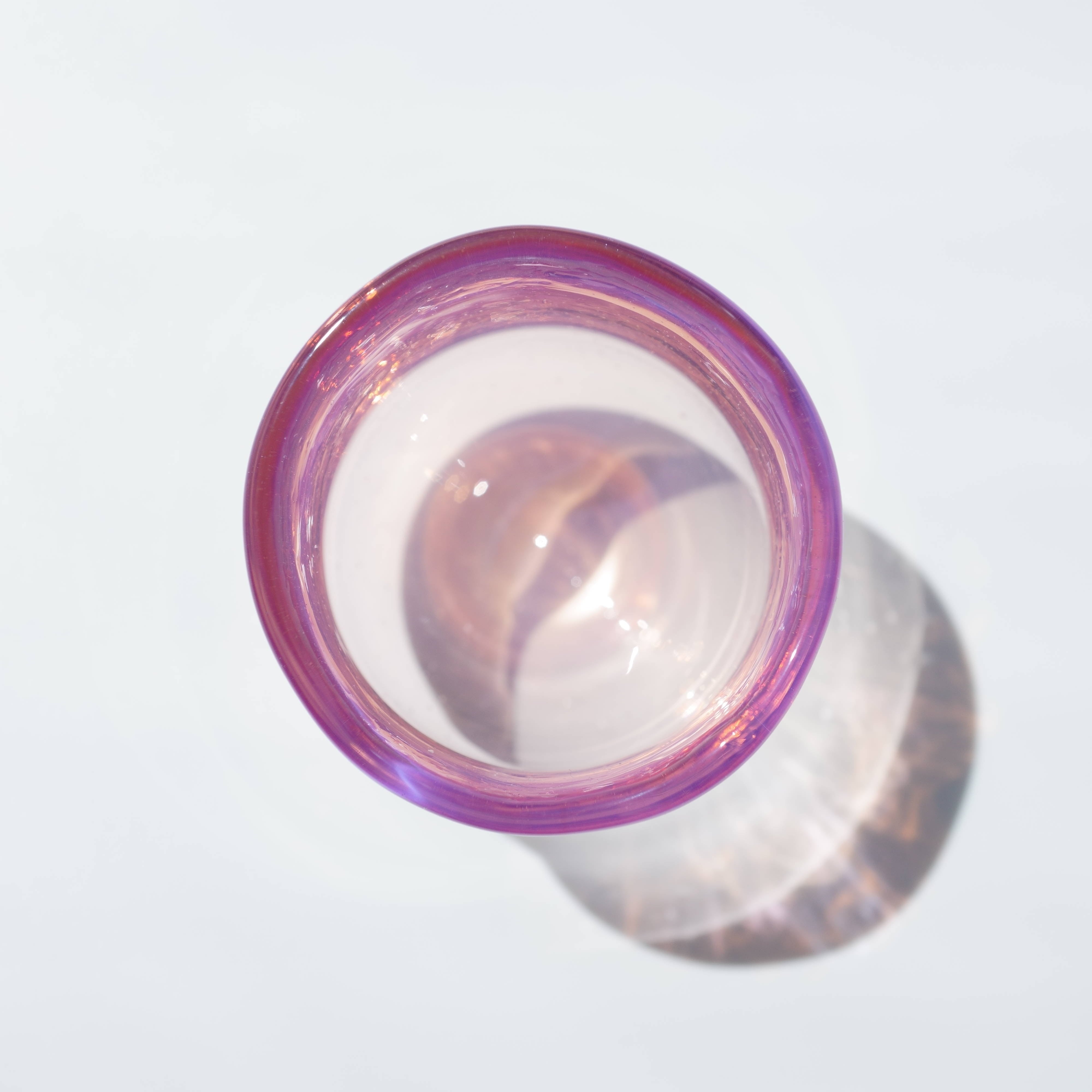 耐熱ガラスで器を作るときは通常ガラス管を用いて製作しますが、きゃろくろの作品は吹きガラスの要領で溶けたガラスの塊を吹いて作っています。ガラス管より色を自由に使えるのが強みですが難しい技法です。貴重な品ですがお試しでお買い得にしています。